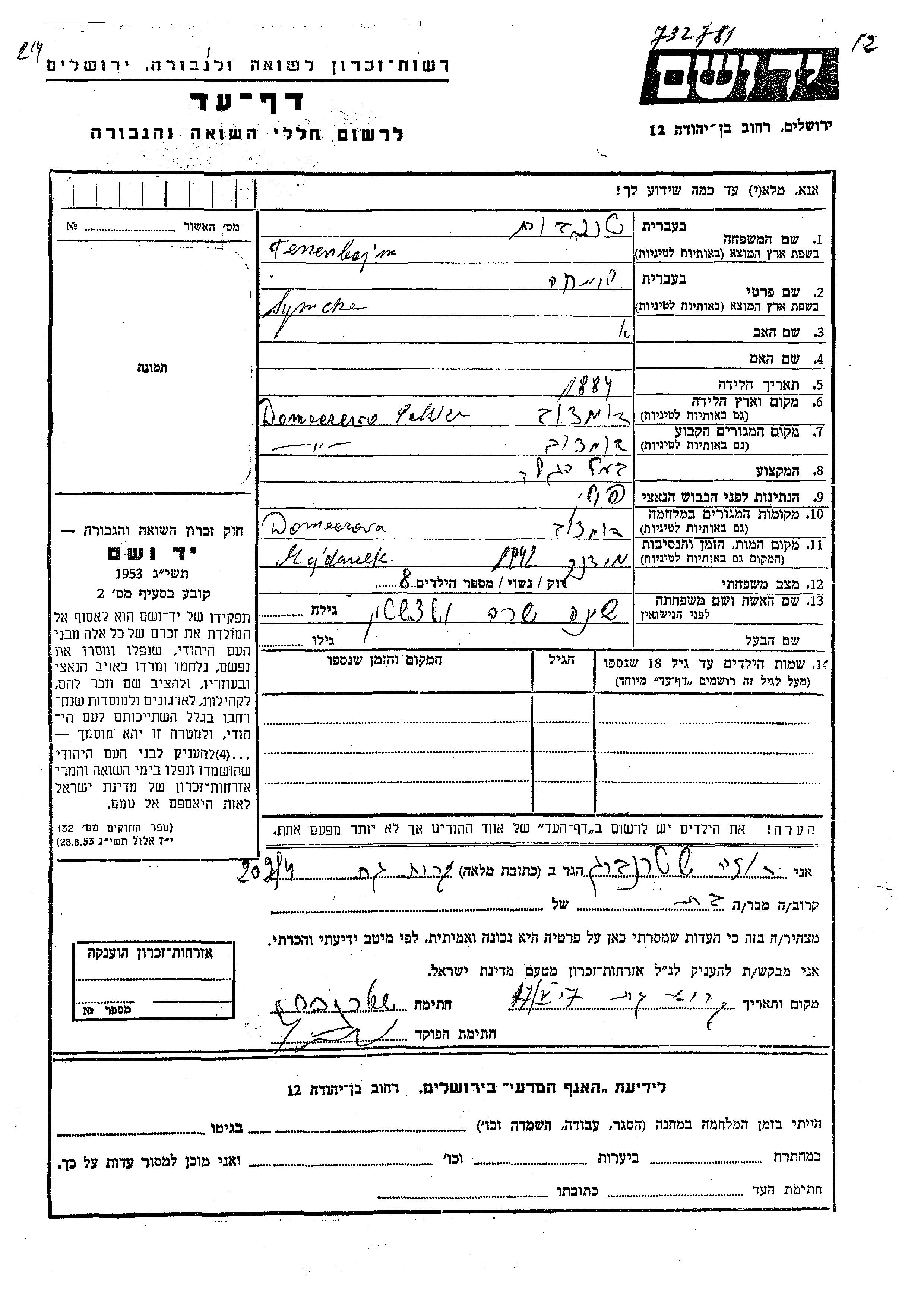 Tenenbojm Simcha 1884 Domaczewo, Pologne Feuille de témoignage