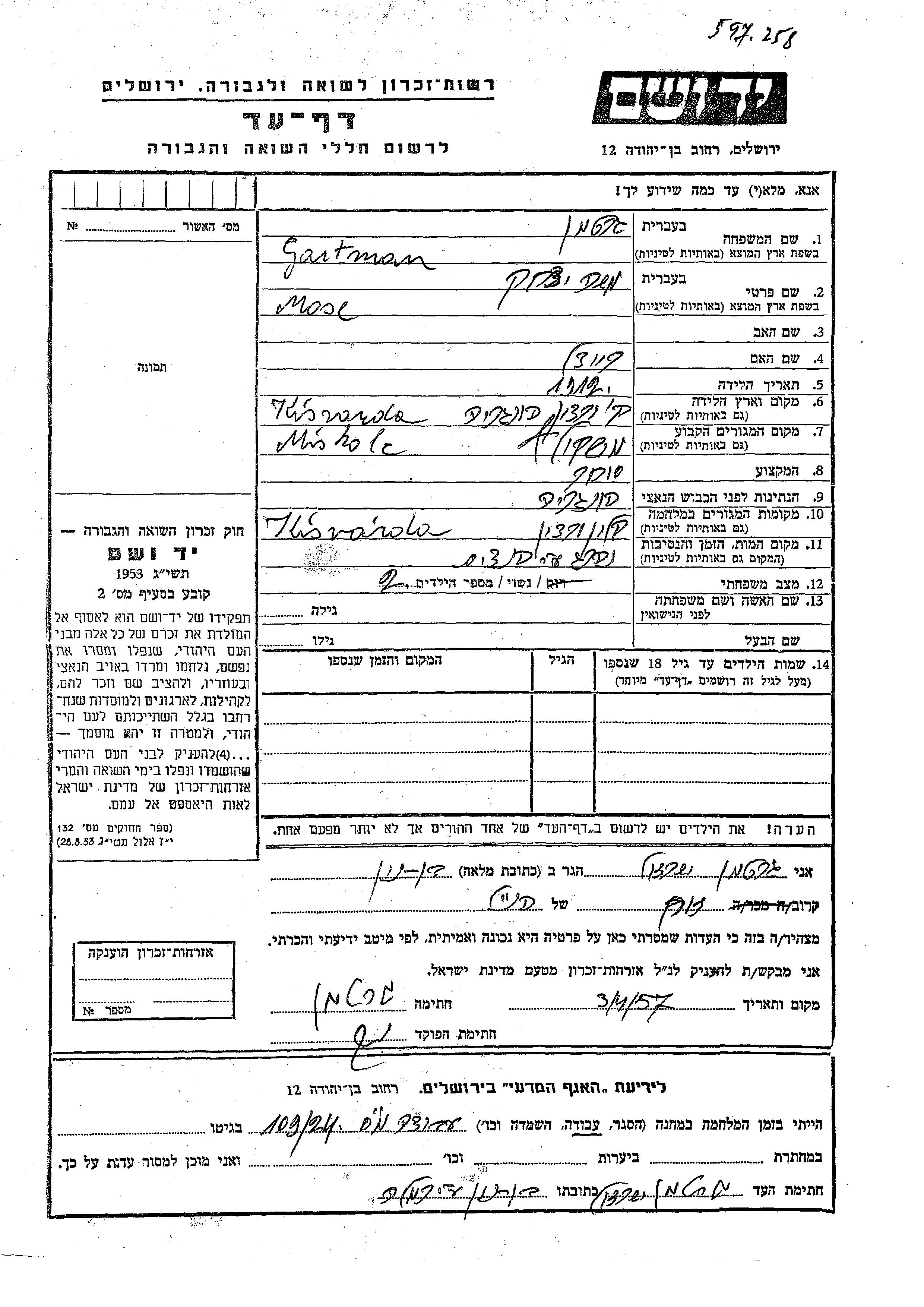 Gartman Mose Yitzkhak 1912 Miskolc, Hongrie Feuille de témoignage