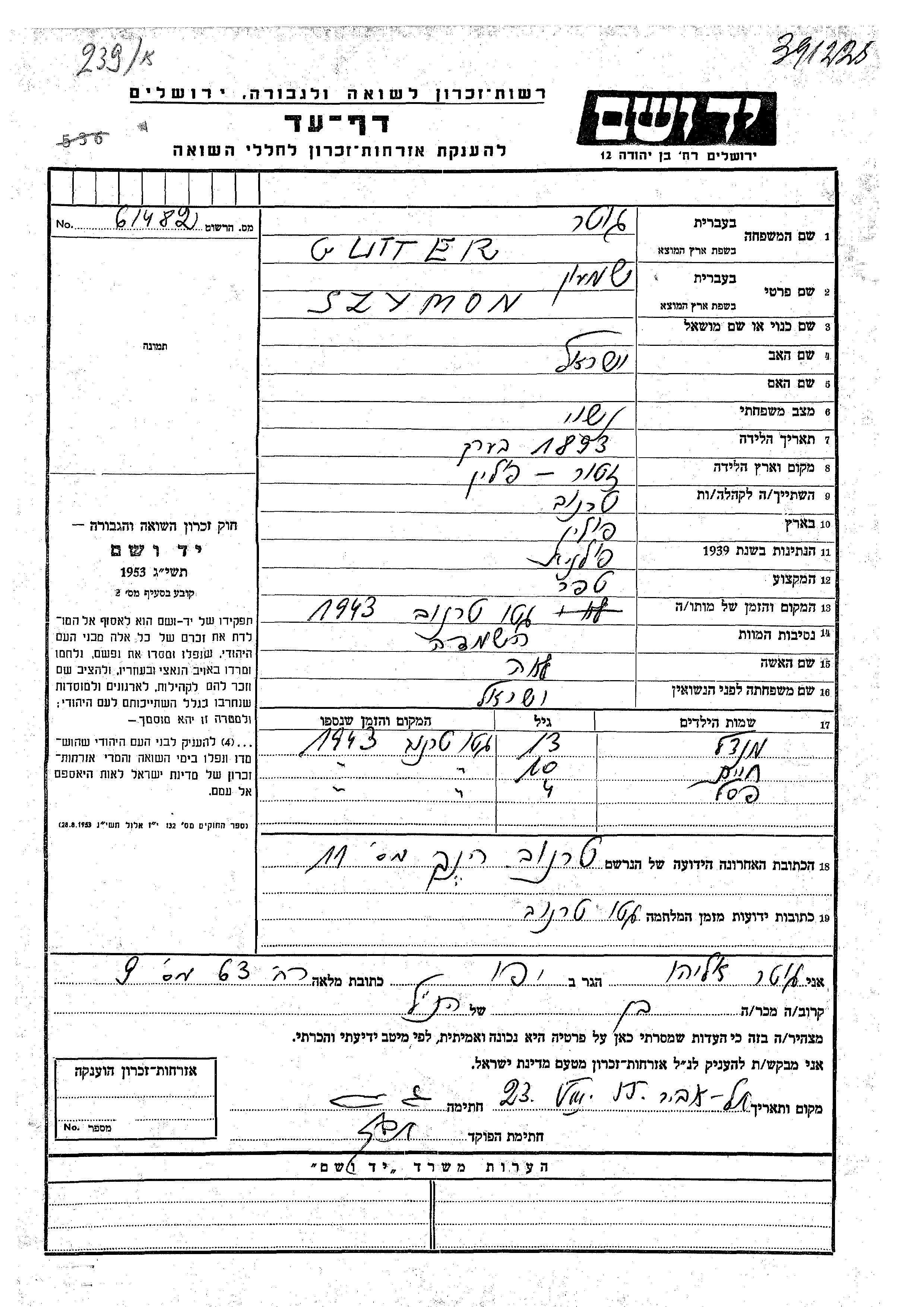 Yad Vashem - Pages of Testimony Names Memorial Collection