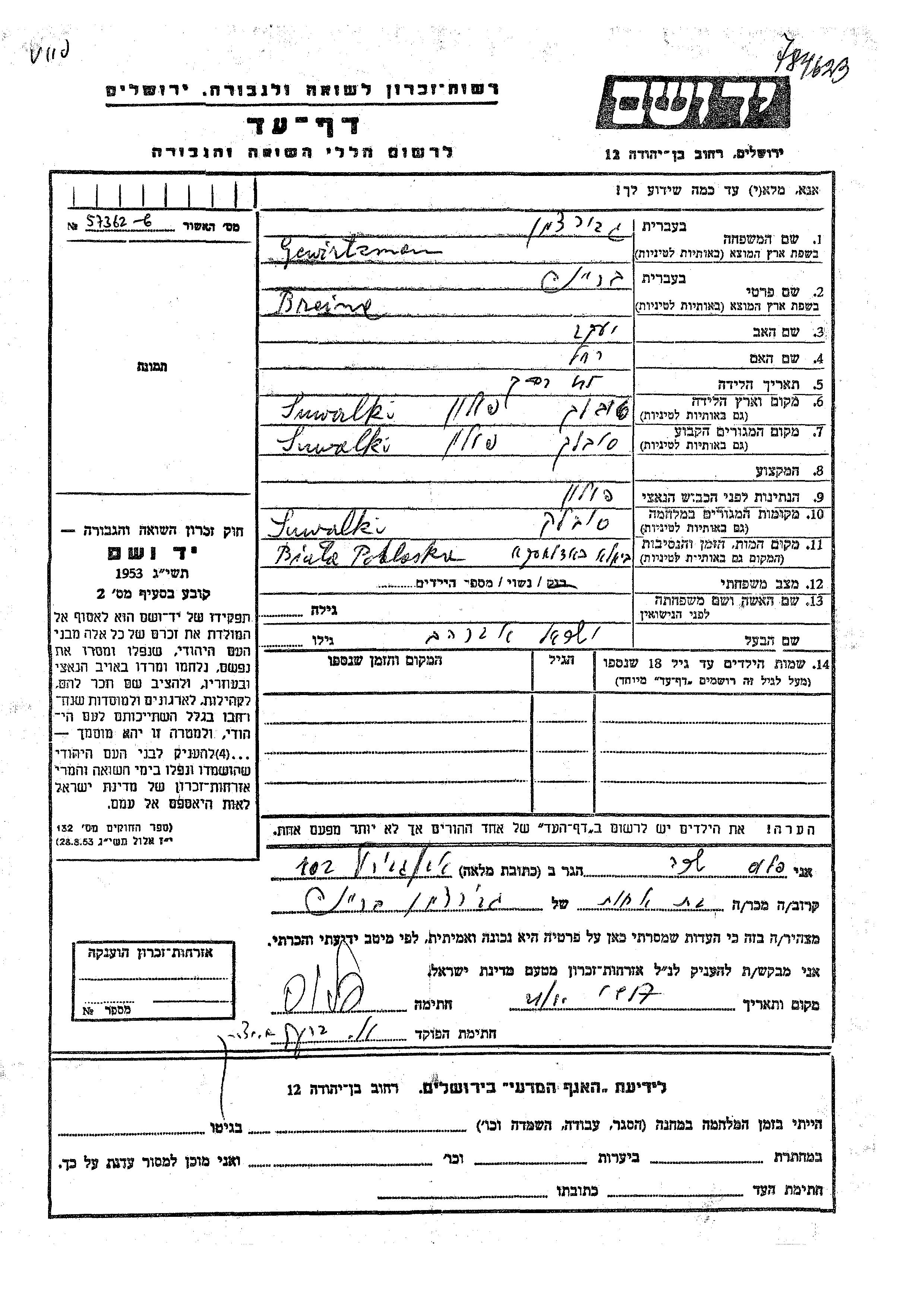 Gewirtzman Breine Suwalki, Pologne Feuille de témoignage