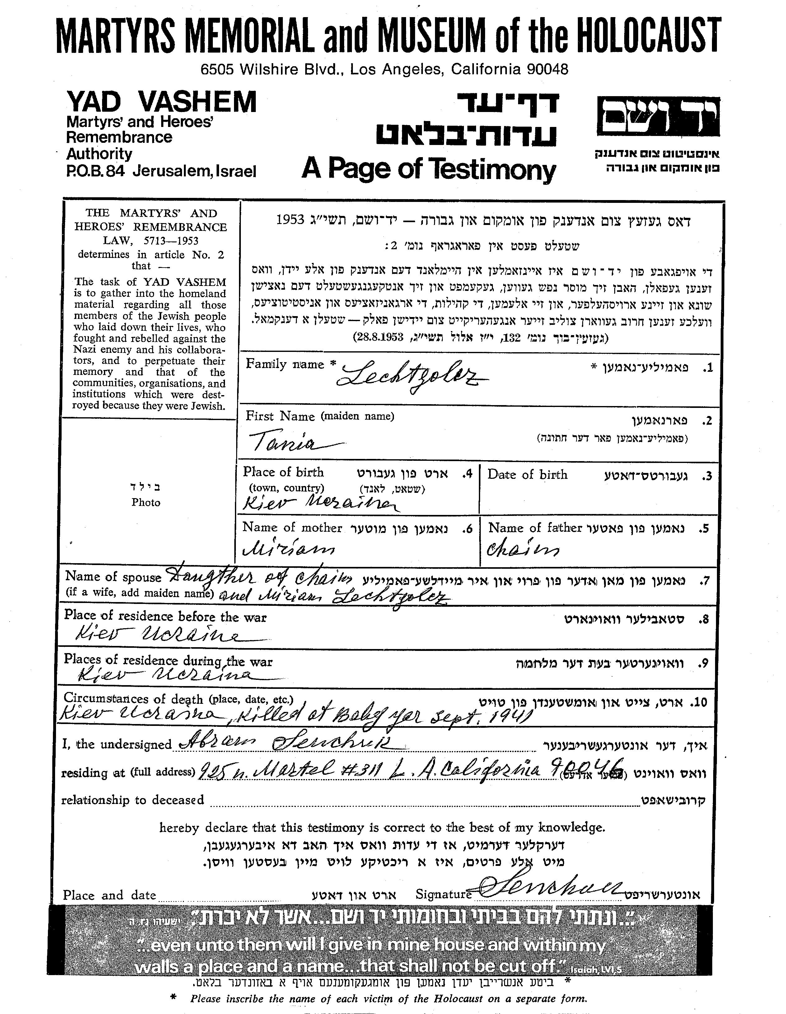 Lekhtgoltz Tania 1926 Kiyev, Ukraine (URSS) Feuille de témoignage