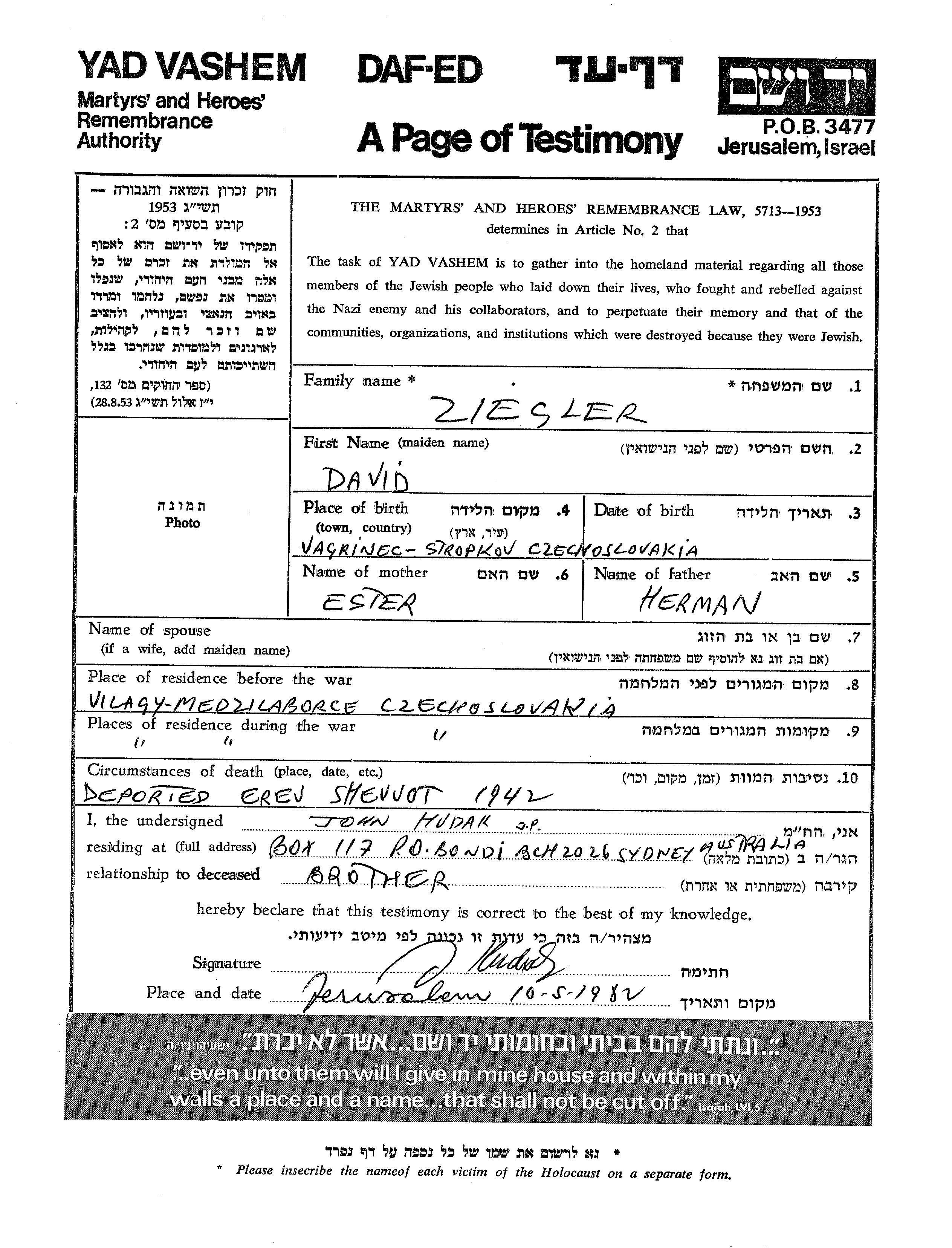 Ziegler David Medzilaborce, Tchécoslovaquie Feuille de témoignage