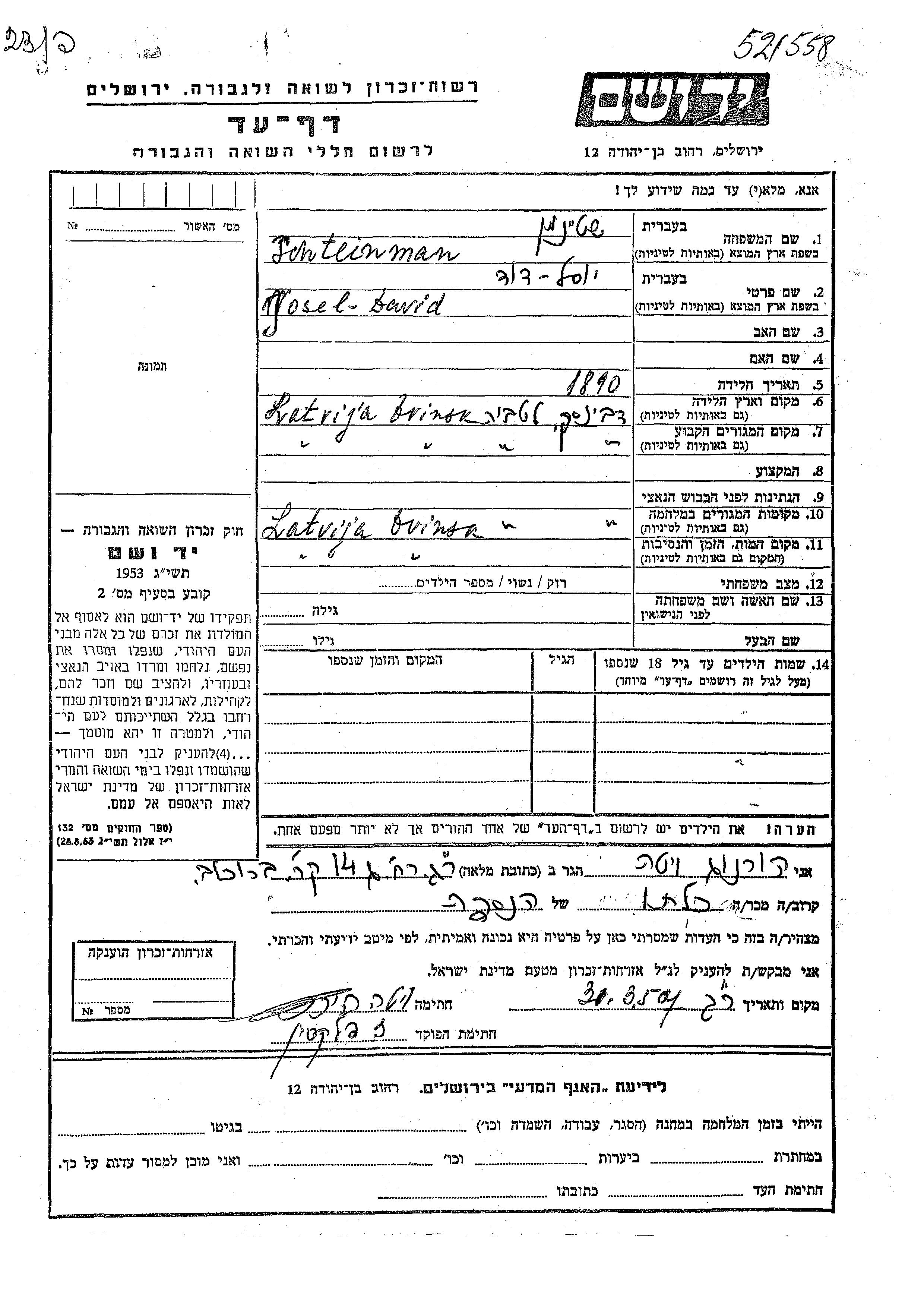 Schteinman Josel Dewid 1890 Dvinsk, Lettonie Feuille de témoignage