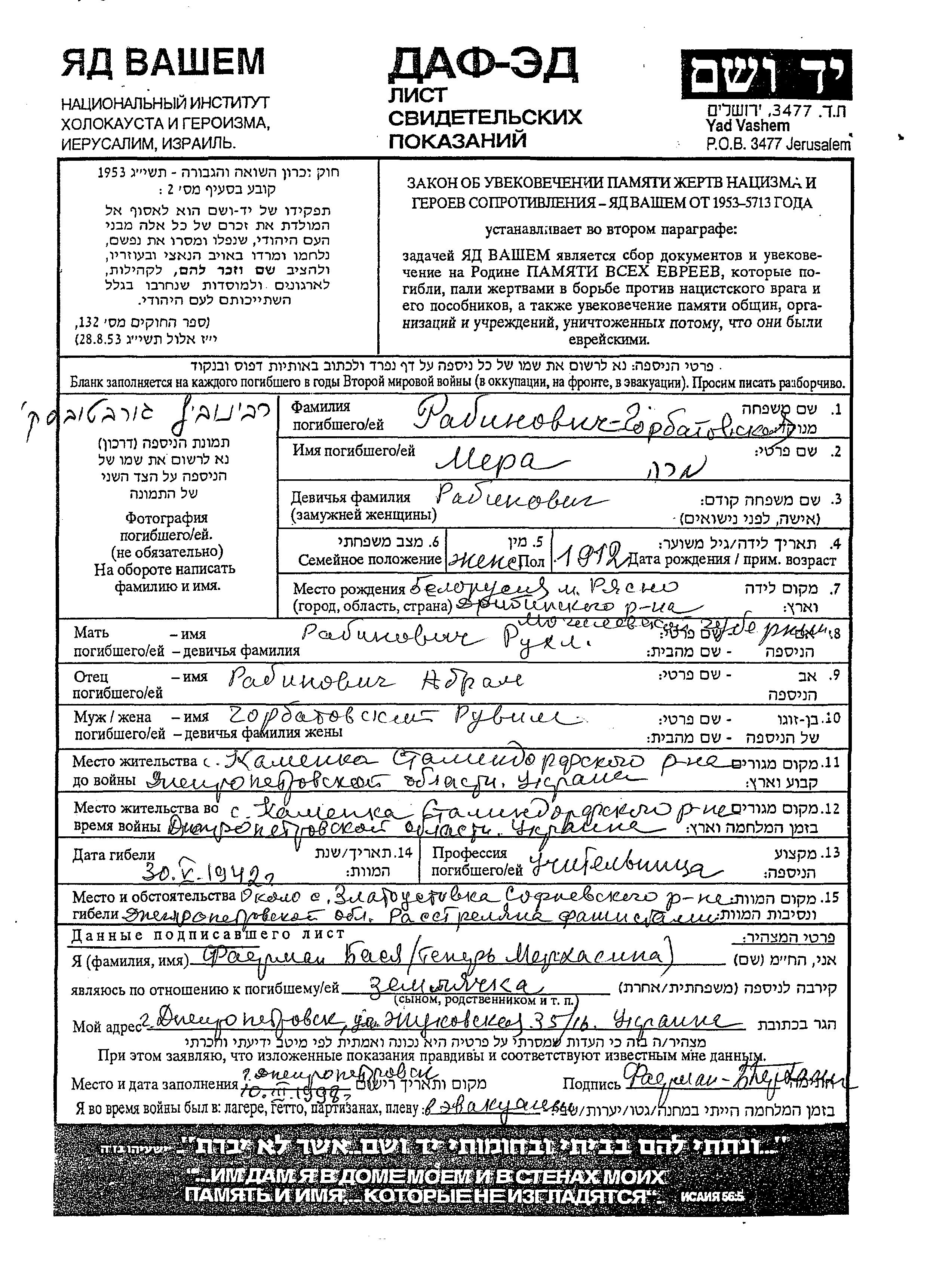 Mera Gorbatovskaya née Rabinovich est née à Ryasno, Bélorussie (URSS) en 1912, fille de Abram et de Rukhl. Elle était Enseignant/e et Mariée à Ruvim. Avant la seconde guerre mondiale elle vivait à Kamenka, Ukraine (URSS). Pendant la guerre, elle était à Kamenka, Ukraine (URSS).