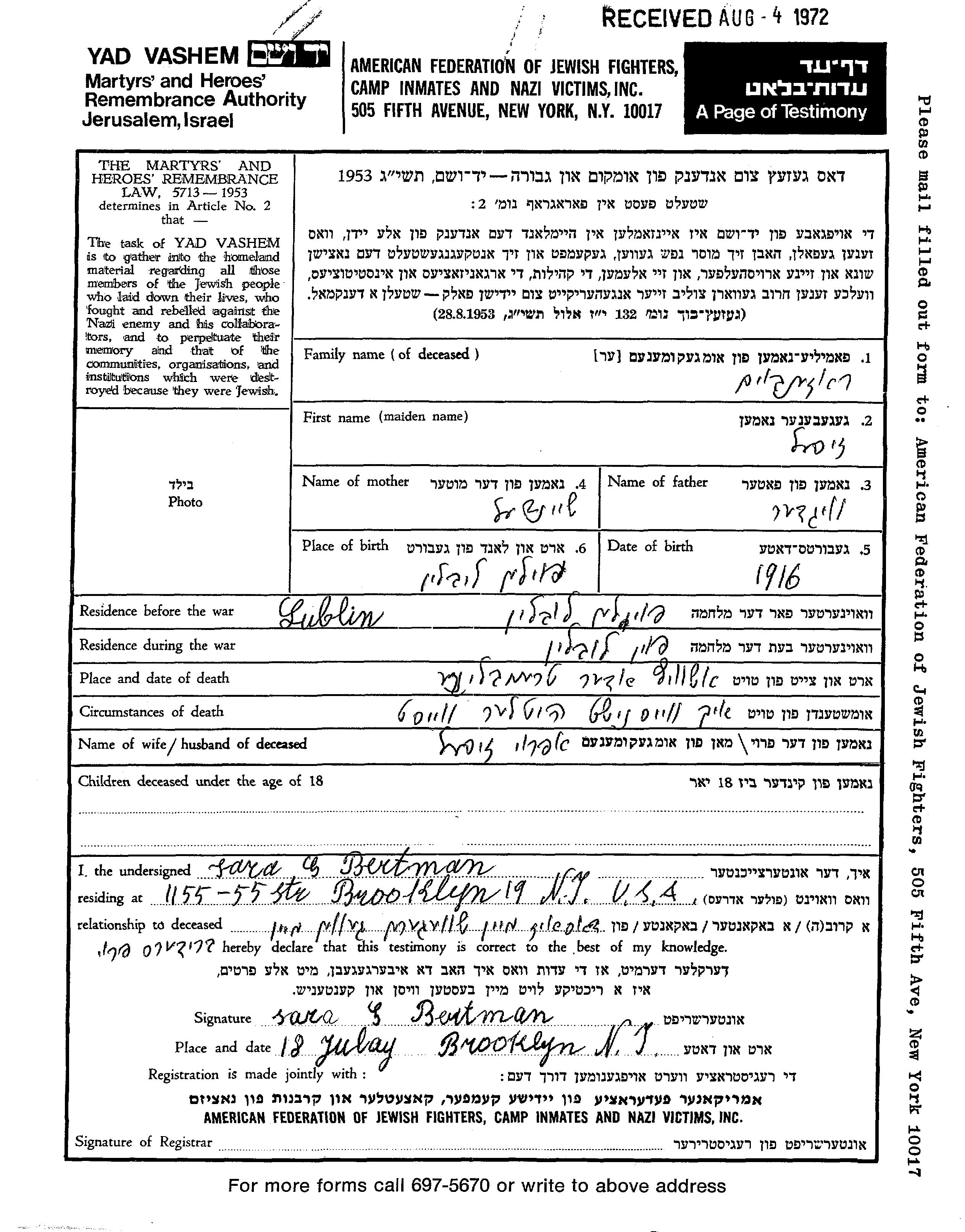 Rozenbaum Zisel 1916 Lublin, Pologne Feuille de témoignage