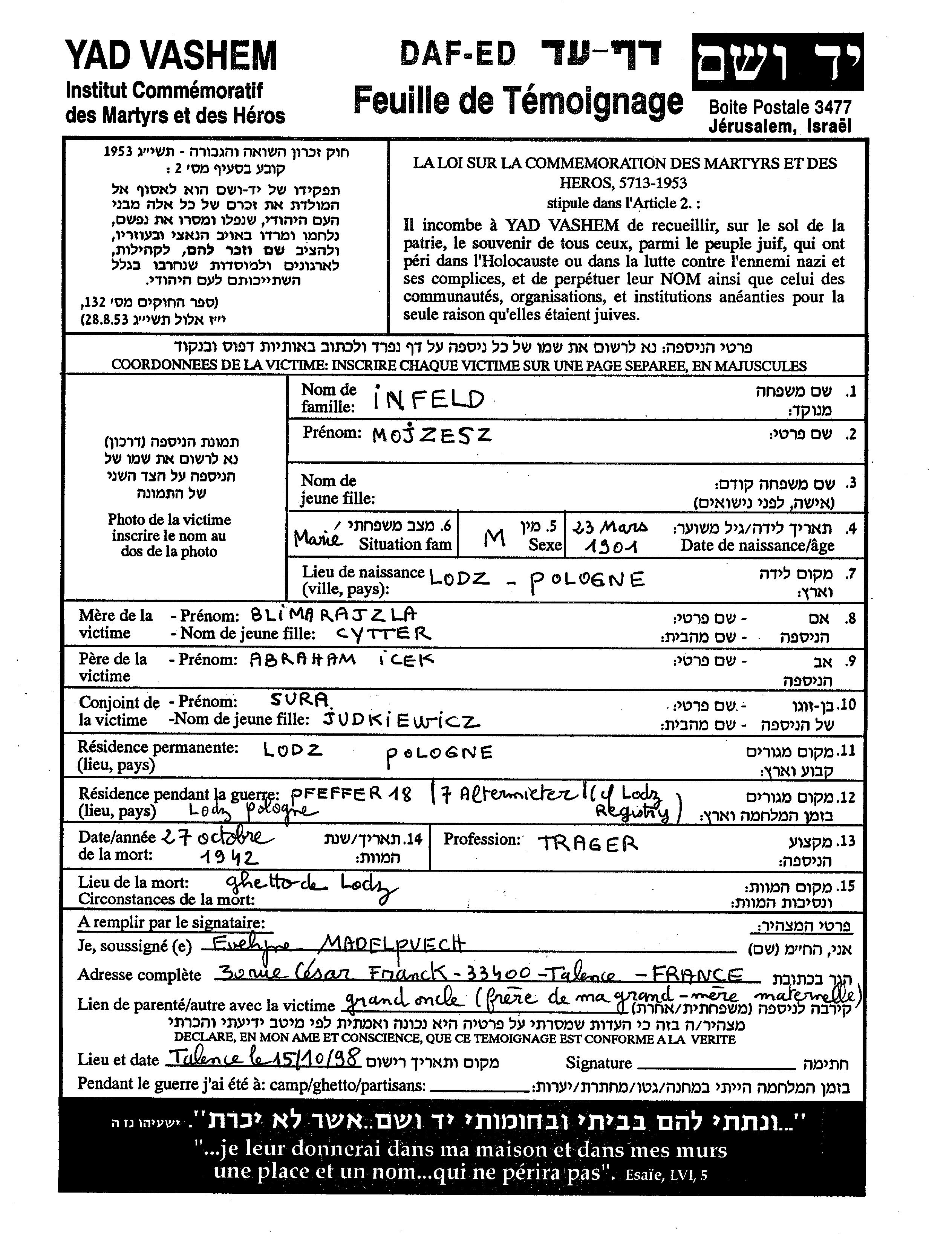 Infeld Mojzesz 1901 Lodz, Pologne Feuille de témoignage