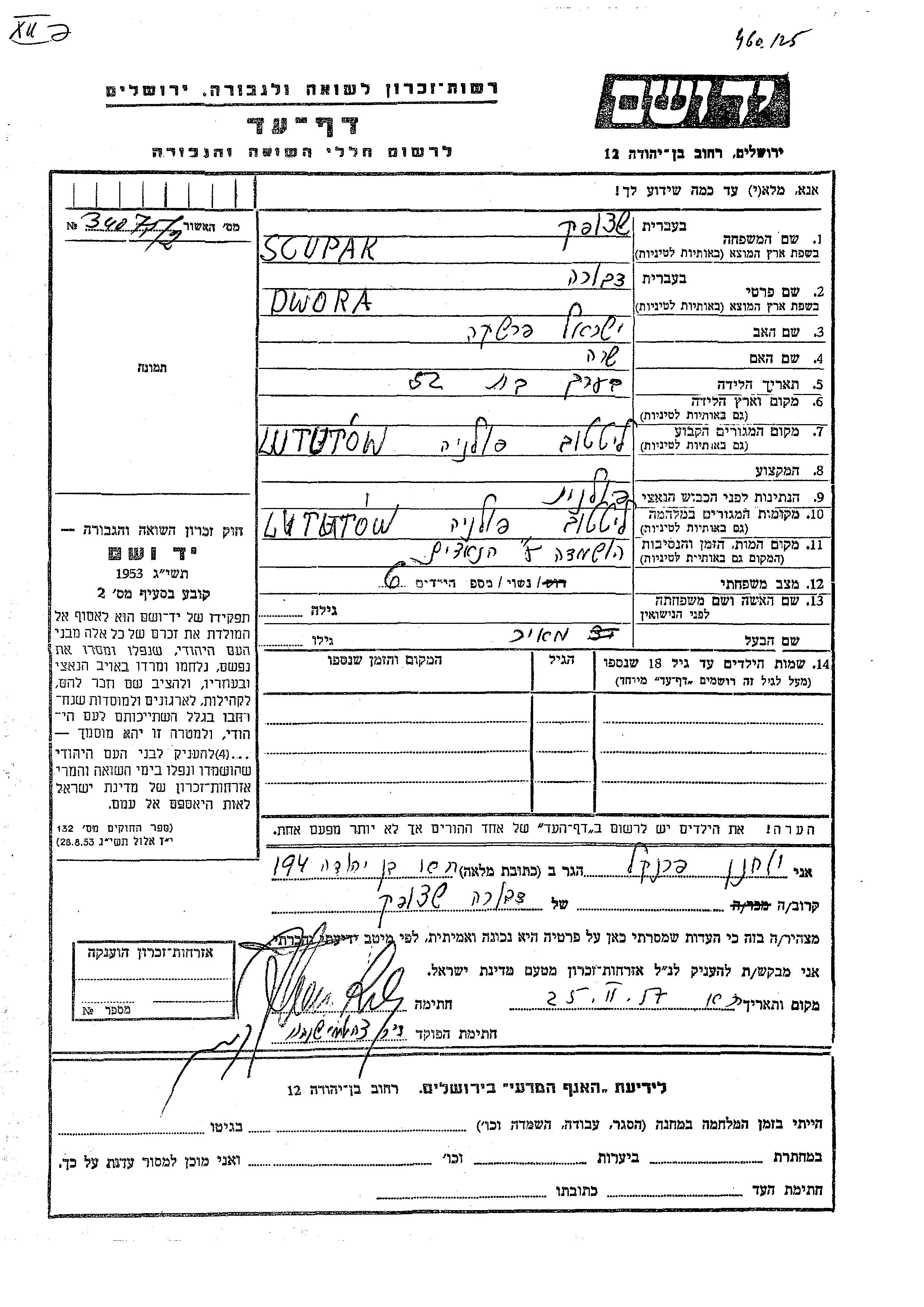 Scupak Dwora Lututow, Pologne Feuille de témoignage