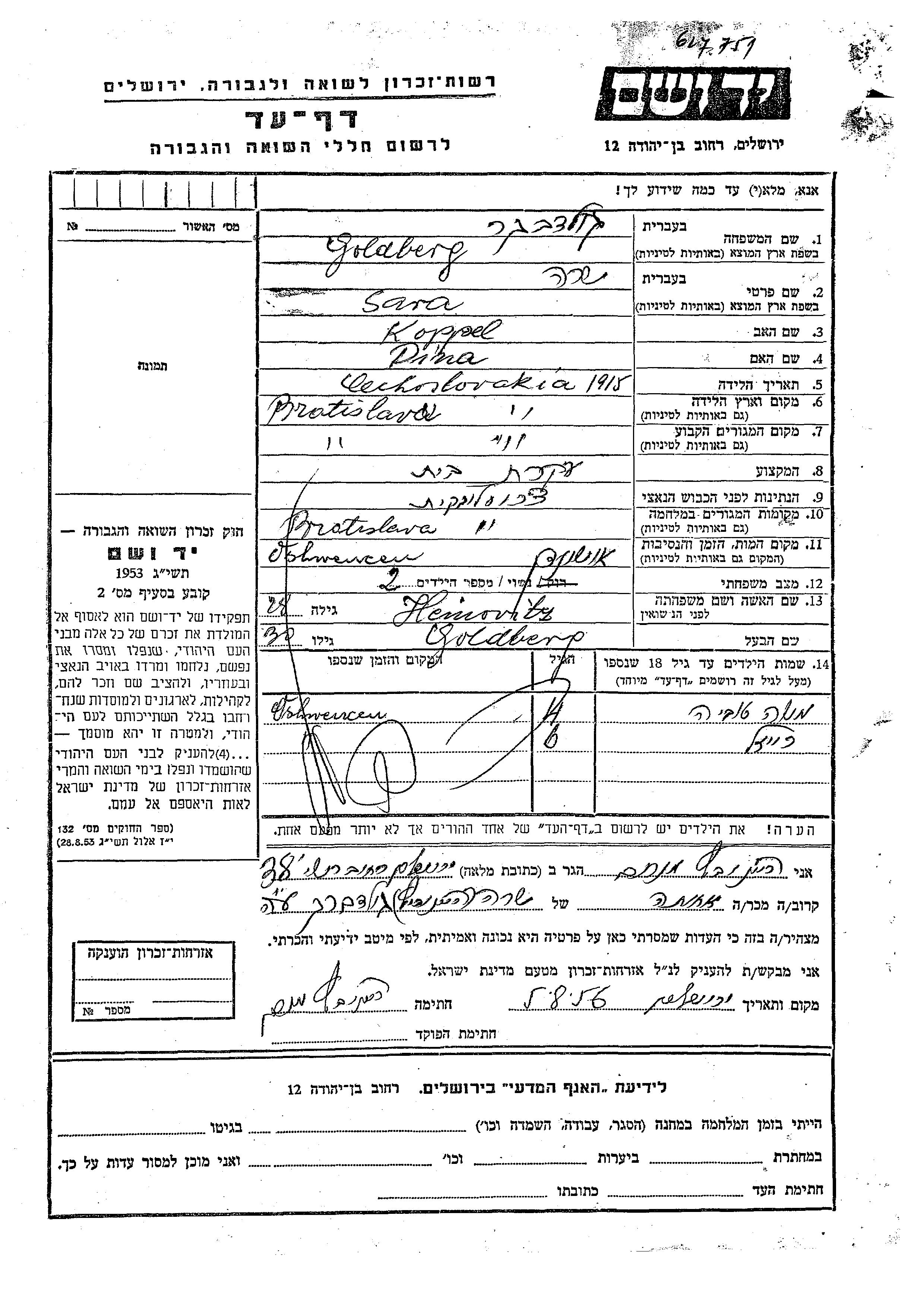Goldberg Sara 1915 Bratislava, Tchécoslovaquie Feuille de témoignage