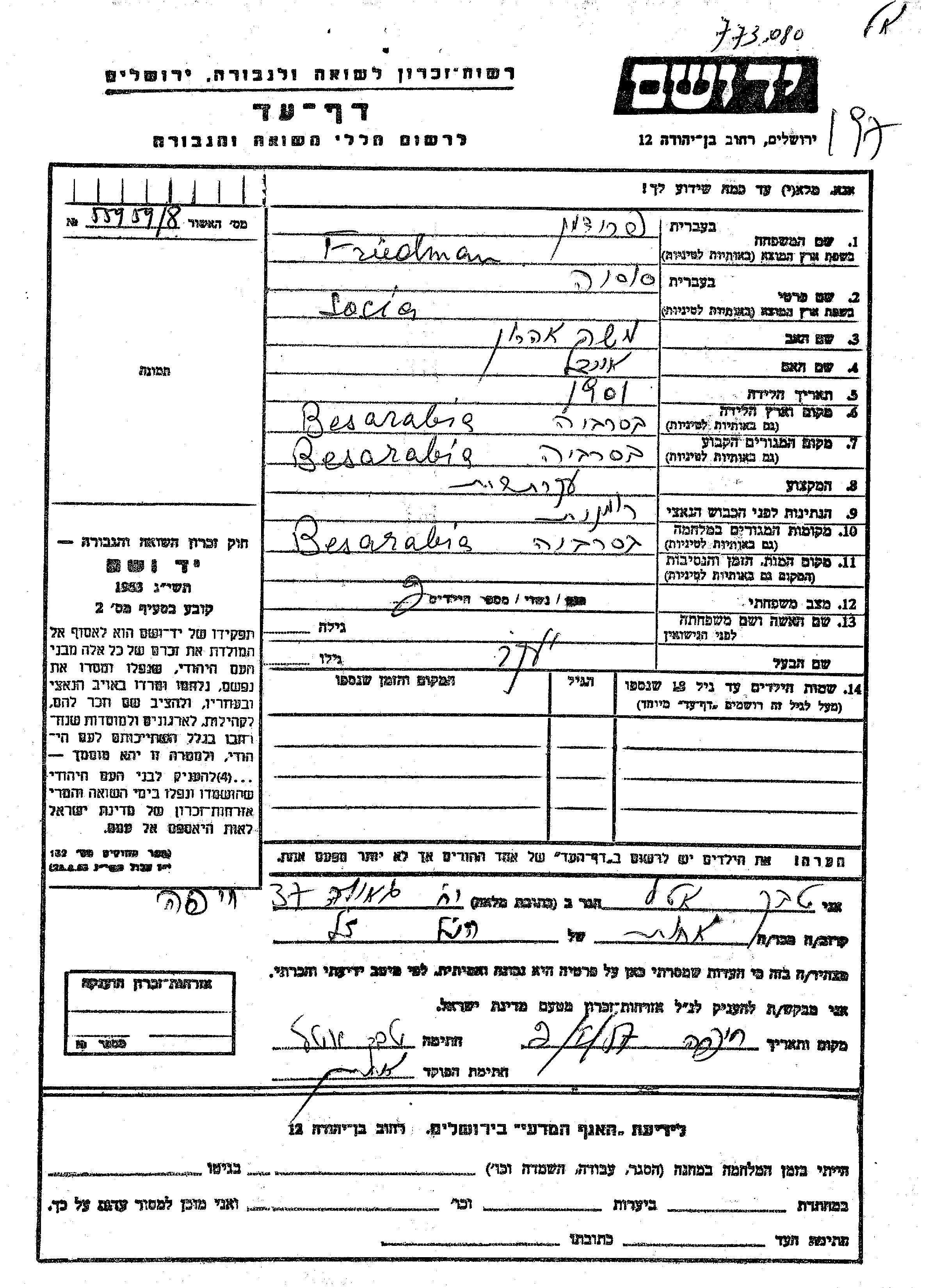 Socia Friedman est née à Bessarabia, Roumanie en 1901, fille de Moshe Aharon et de Eidel. Elle était Femme au foyer et Mariée à Yaakov. Avant la seconde guerre mondiale elle vivait à Bessarabia, Roumanie. Pendant la guerre, elle était à Bessarabia, Roumanie.