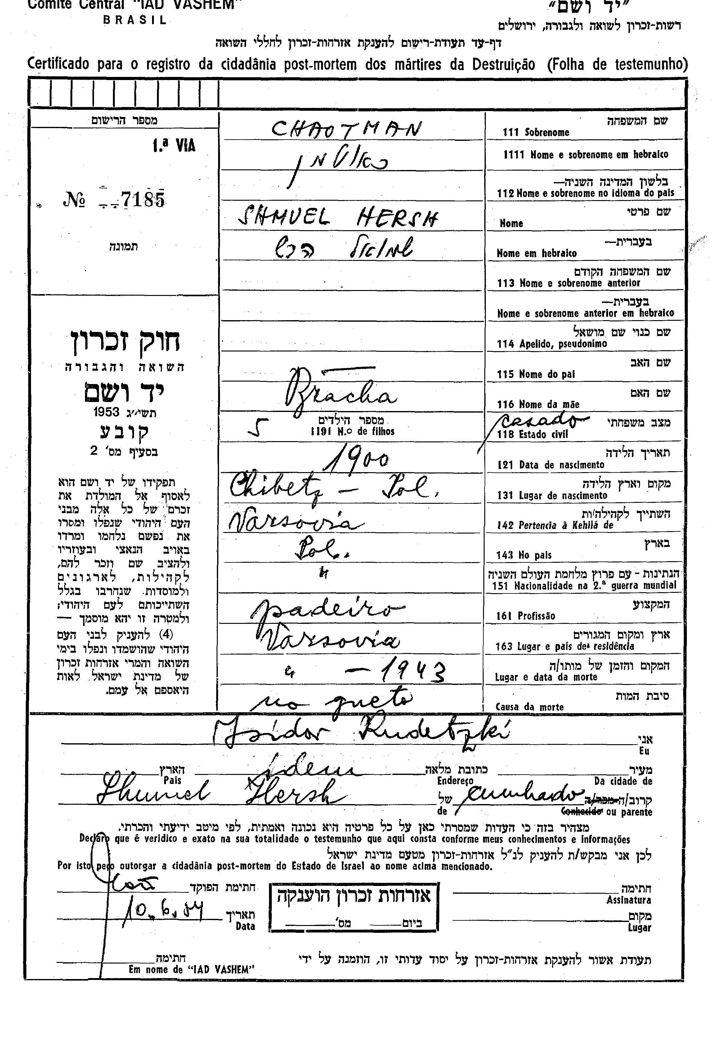 Chaotman Hersh Shmuel 1900 Warszawa, Pologne Feuille de témoignage