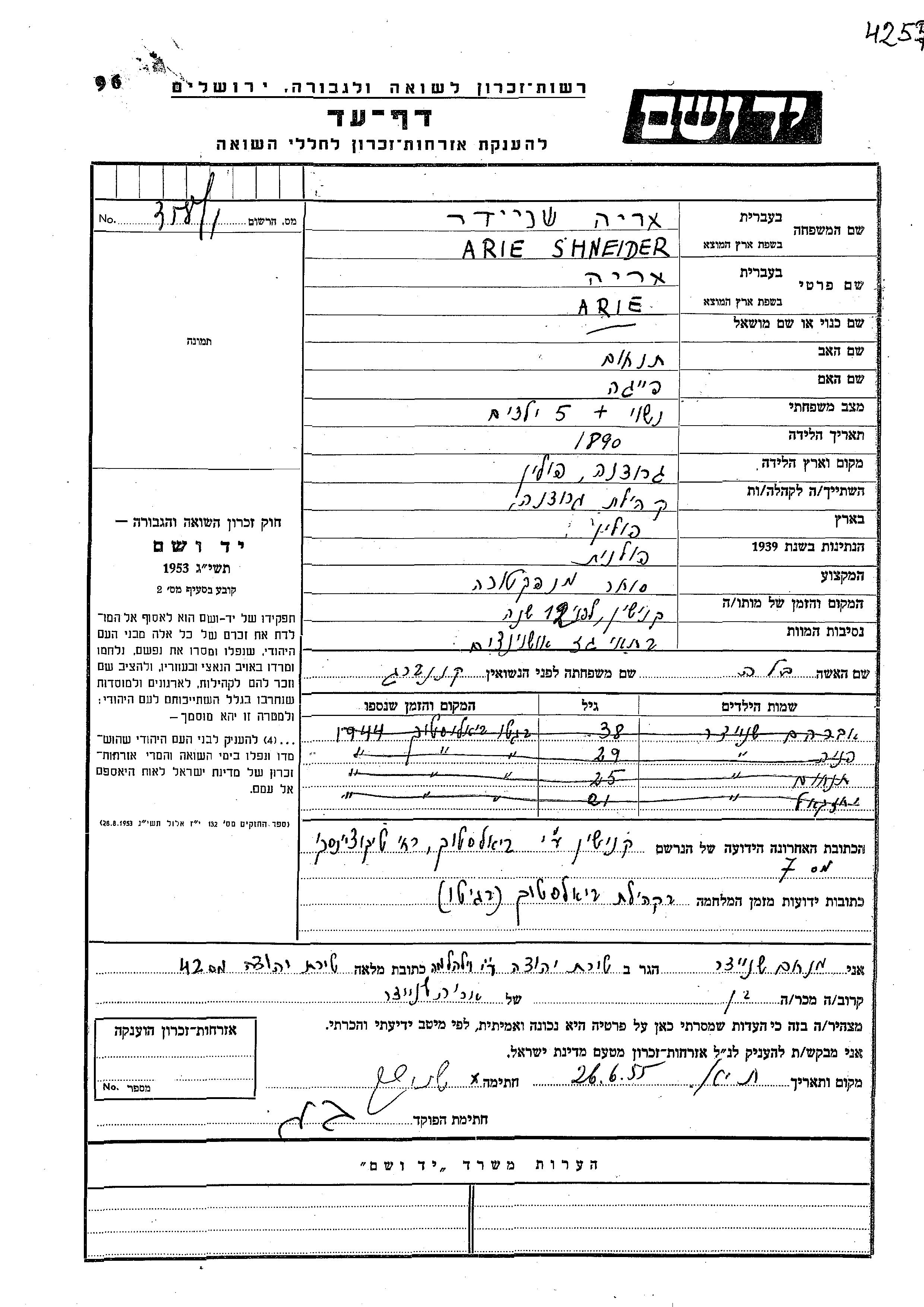 Shneider Arie 1890 Grodno, Pologne Feuille de témoignage