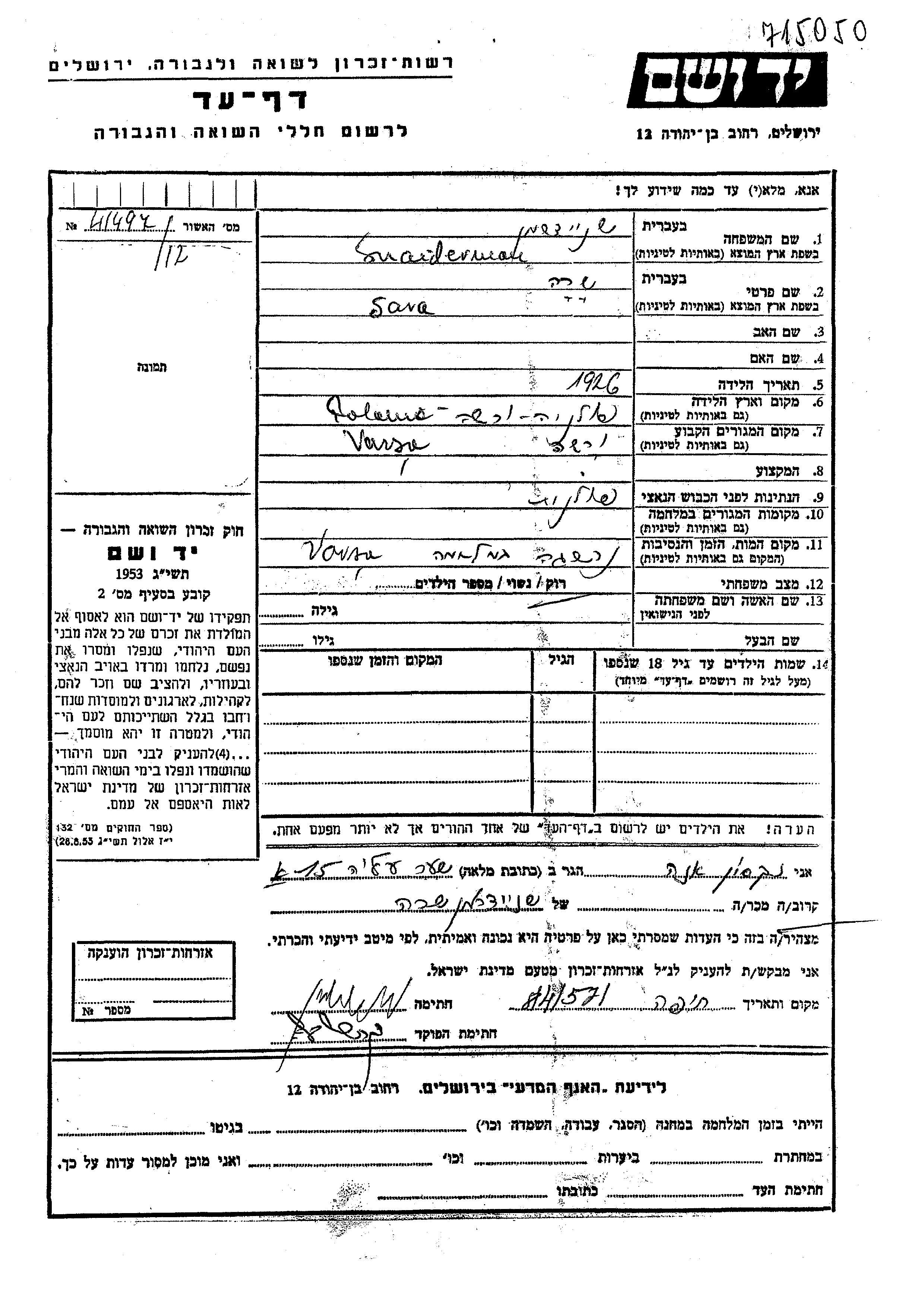 Snaiderman Sara 1926 Varsha, Pologne Feuille de témoignage