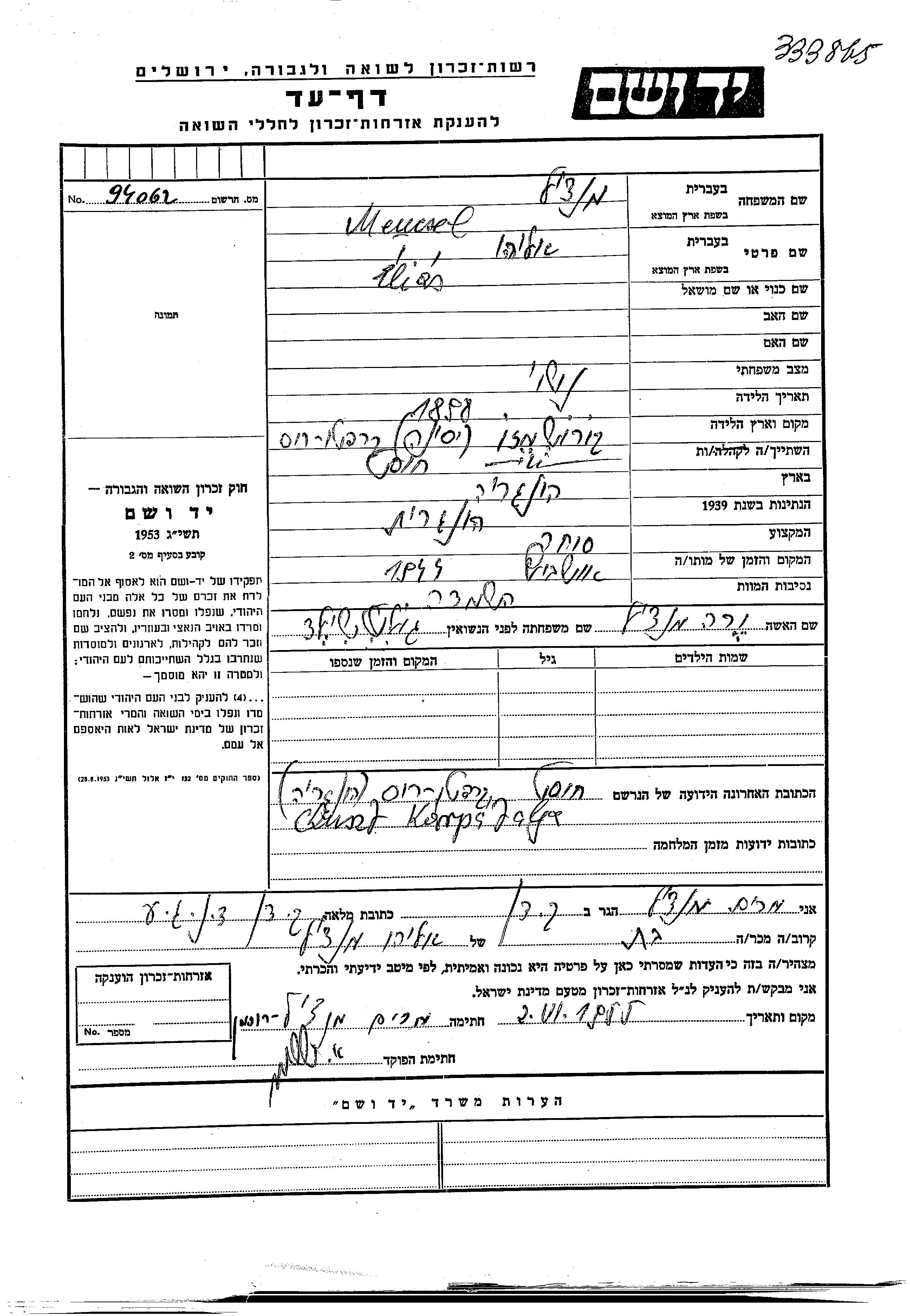 Elias Mencsel est né à Korosmezo, Tchécoslovaquie en 1898. Il était Commerçant/e et Mariée à Vera née Goldshild. Avant la seconde guerre mondiale il vivait à Hongrie. Au cours de la guerre, il était à Chust, Tchécoslovaquie.