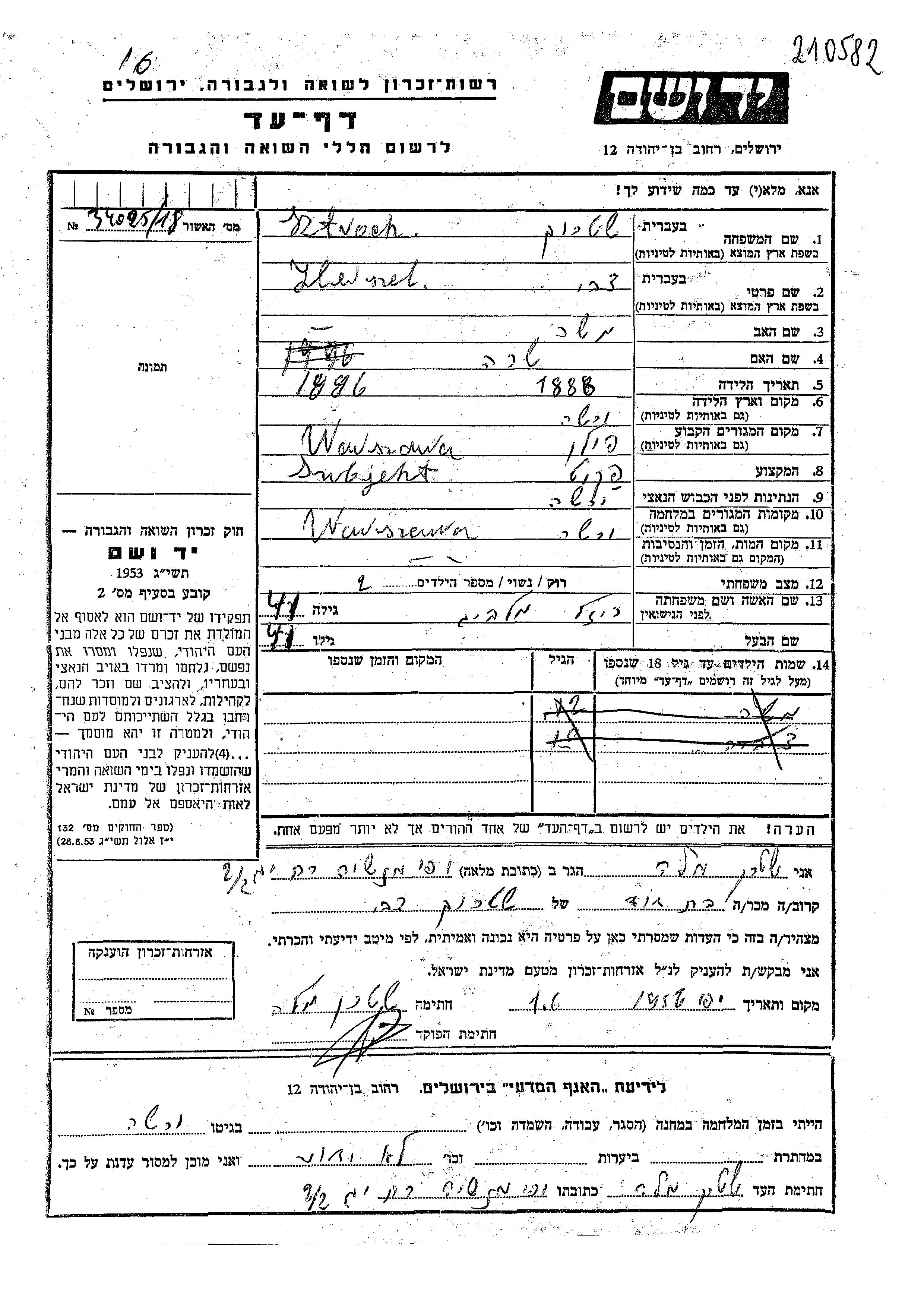 Sztroch Herszel Tzvi 1888 Warszawa, Pologne Feuille de témoignage