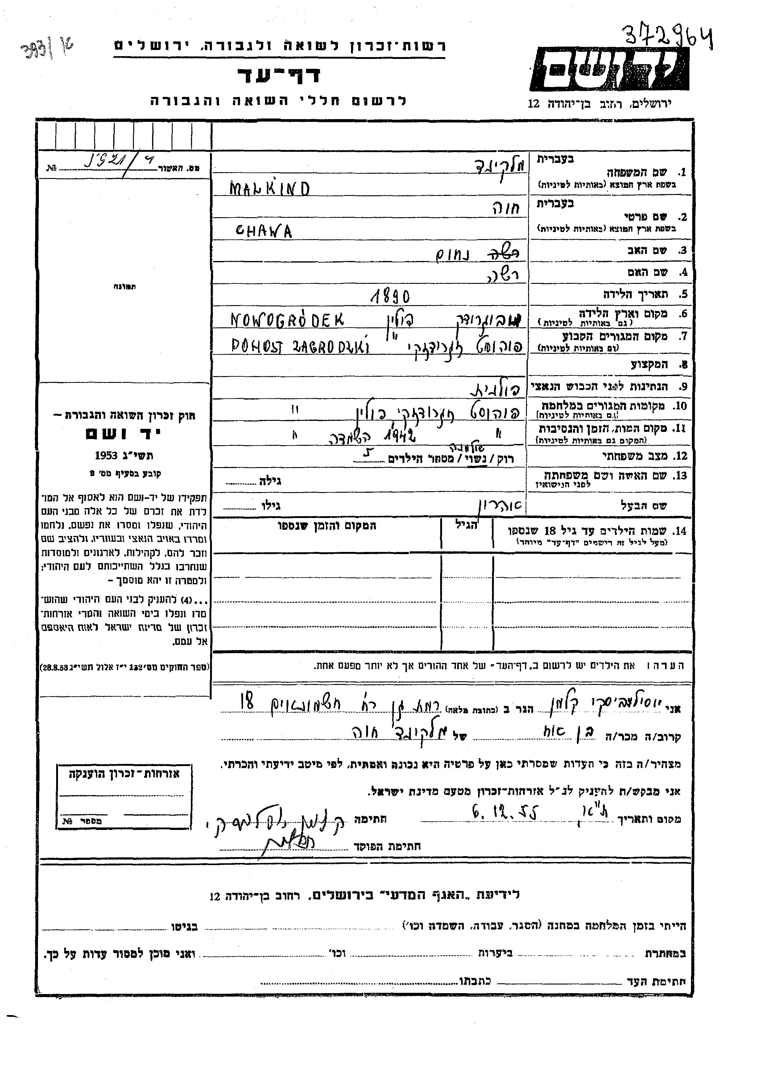 Yad Vashem - Pages of Testimony Names Memorial Collection