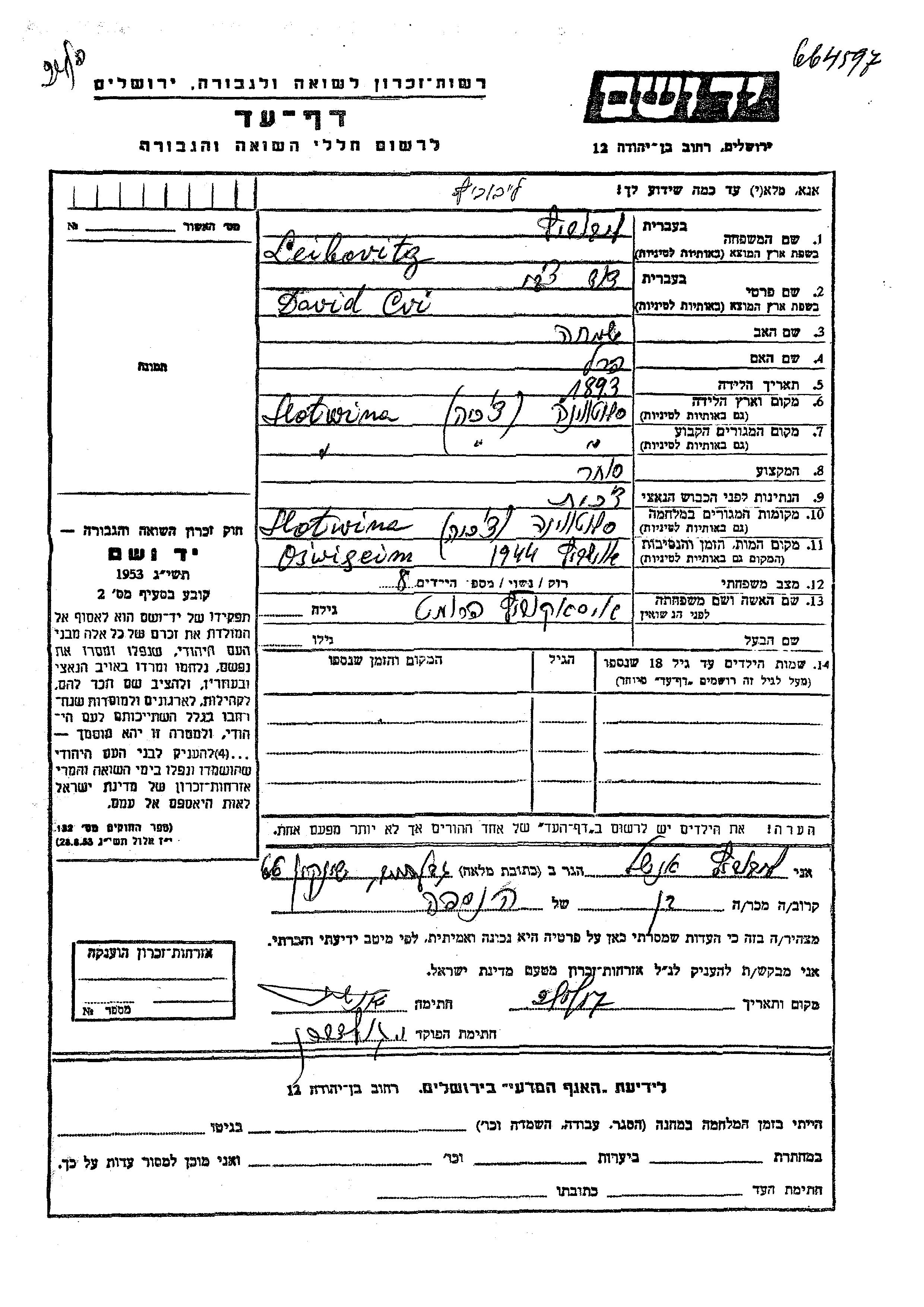 Leibovitz Dawid Cvi 1893 Slatvina, Tchécoslovaquie Feuille de témoignage
