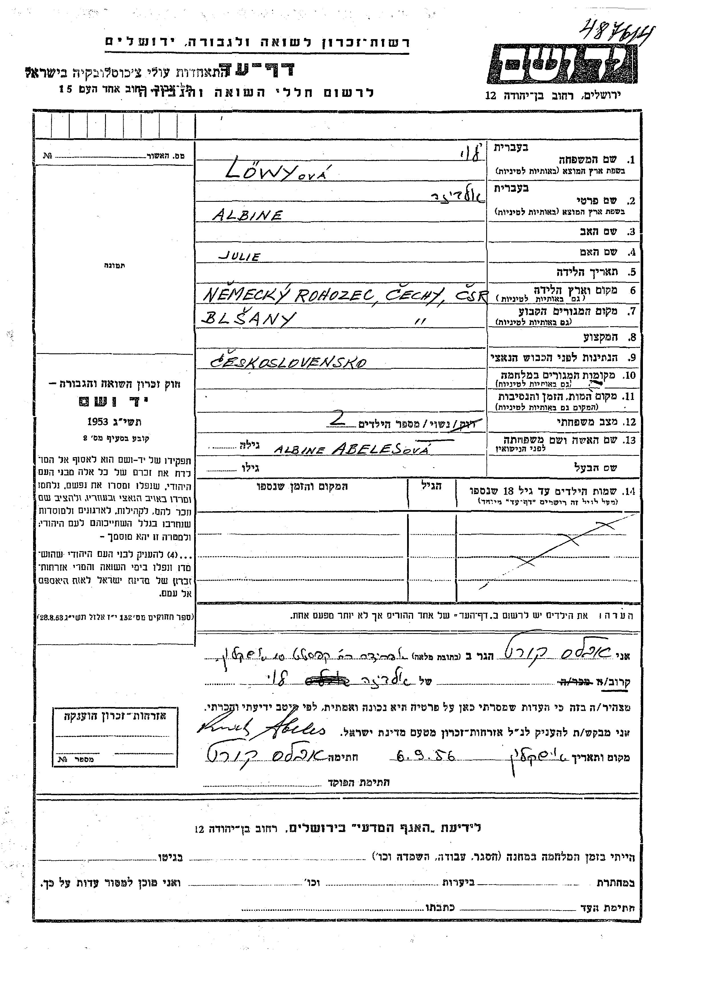 Albine Lowyova née Abelesova est née à Nemecky Rohozec, Tchécoslovaquie, fille de Julie. Elle était Mariée. Avant la seconde guerre mondiale elle vivait à Blsany, Tchécoslovaquie.