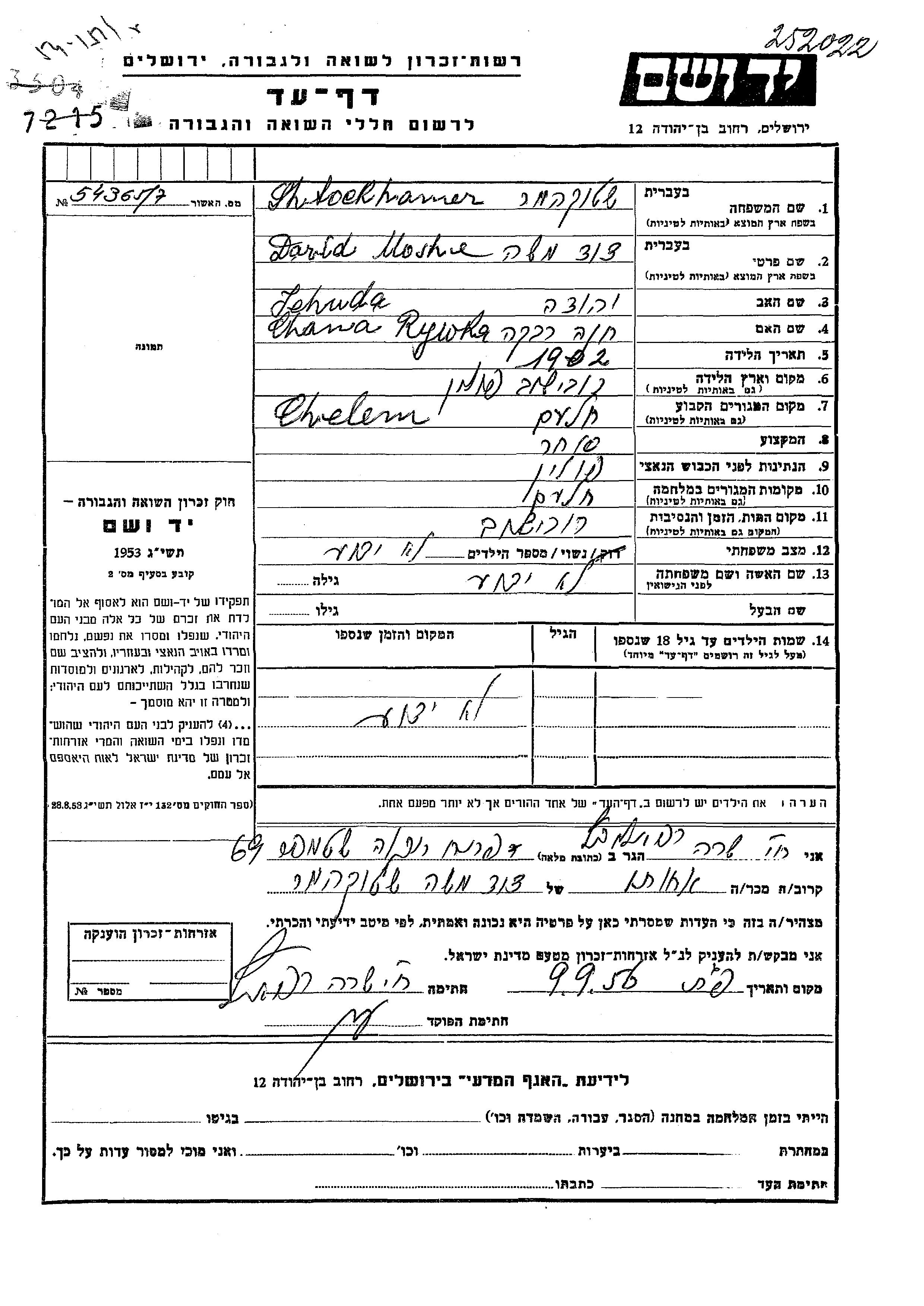 Shtockhamer David Moshe 1902 Chelem, Pologne Feuille de témoignage