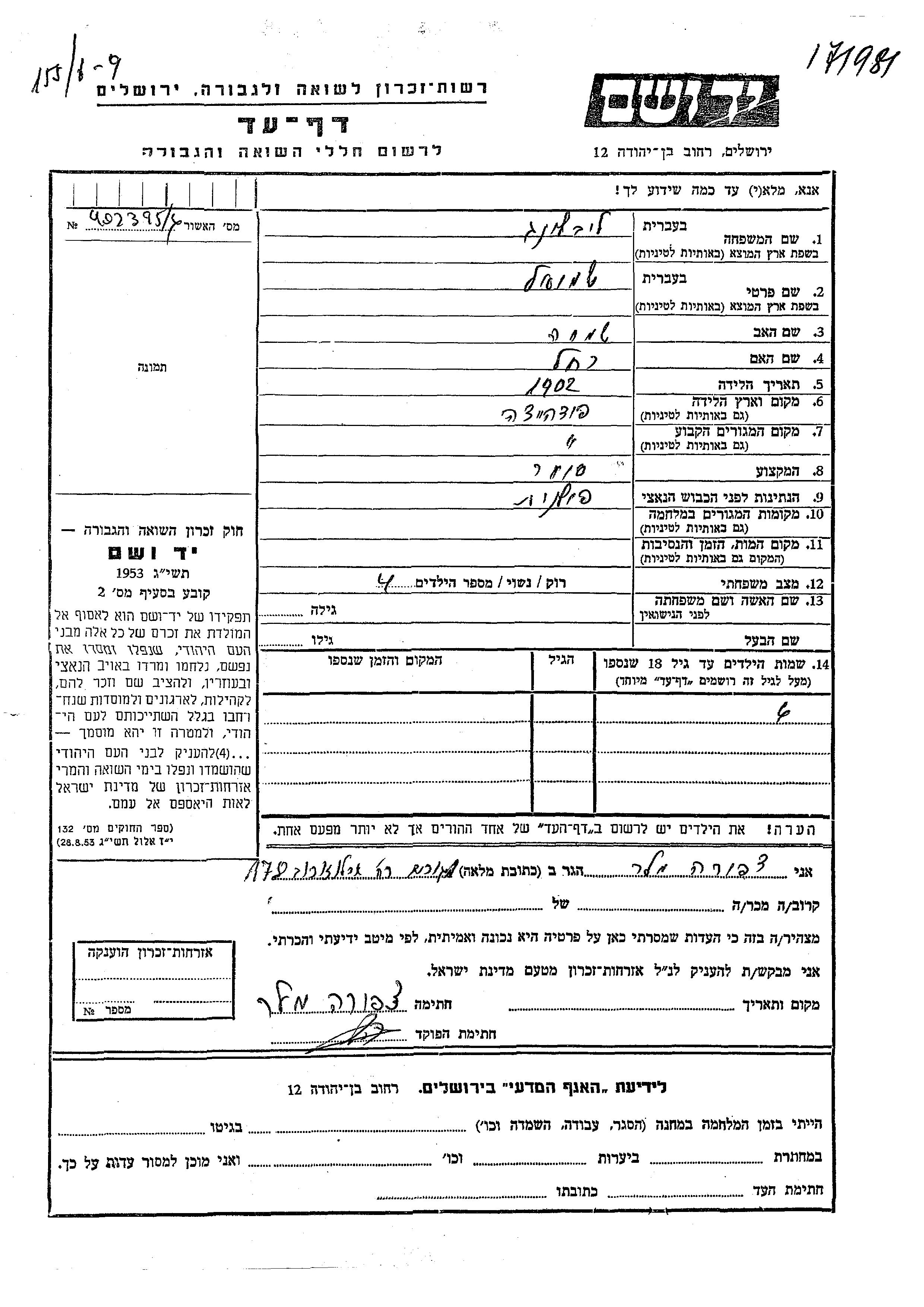 Libling Shmuel 1902 Podhajce, Pologne Feuille de témoignage