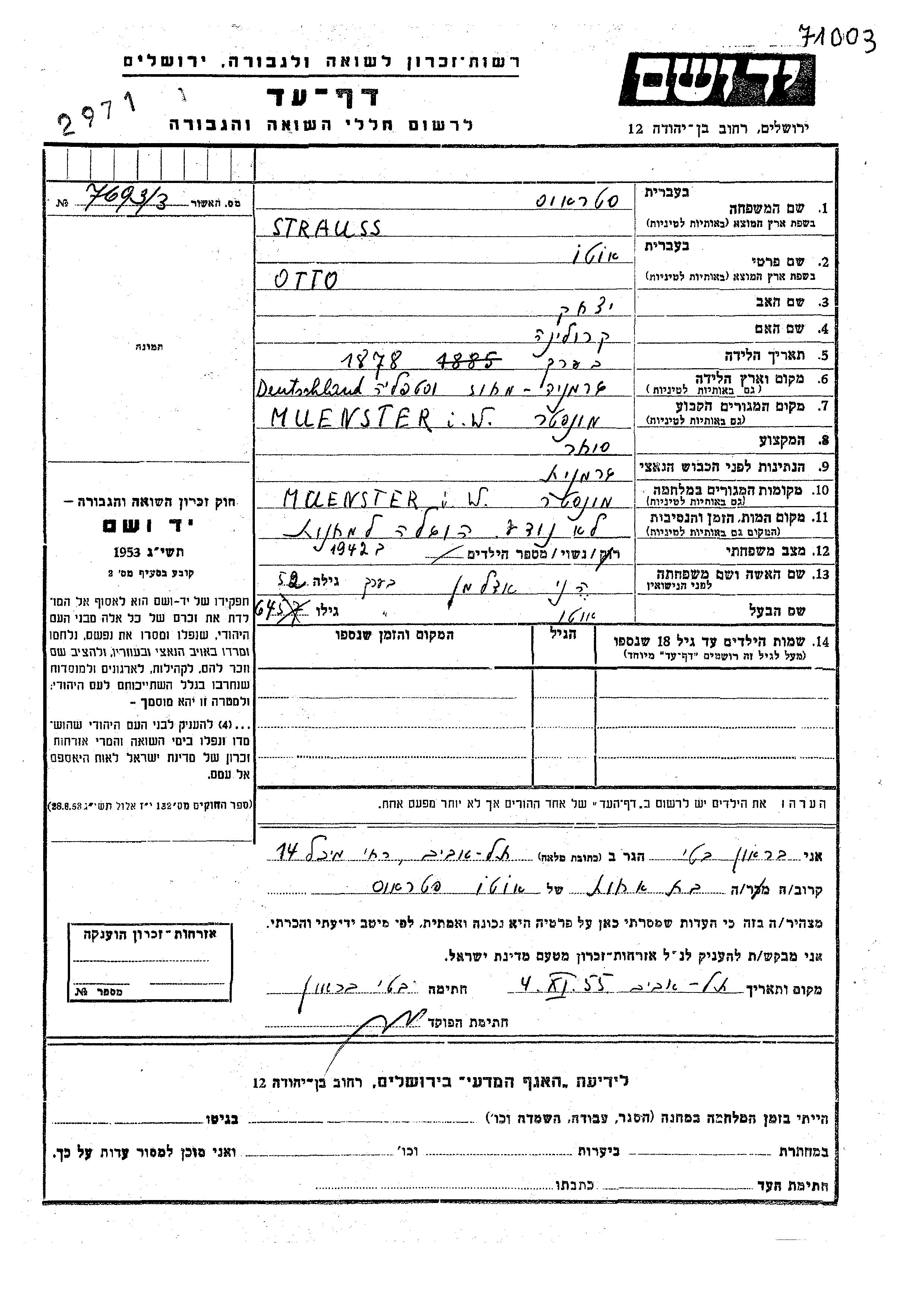 Otto Strauss est né à Westphalia, Allemagne en 1878, fils de Yitzkhak et de Karolina. Il était Commerçant/e et Mariée à Heni née Edelman. Avant la seconde guerre mondiale il vivait à Muenster, Allemagne. Au cours de la guerre, il était à Muenster, Allemagne.