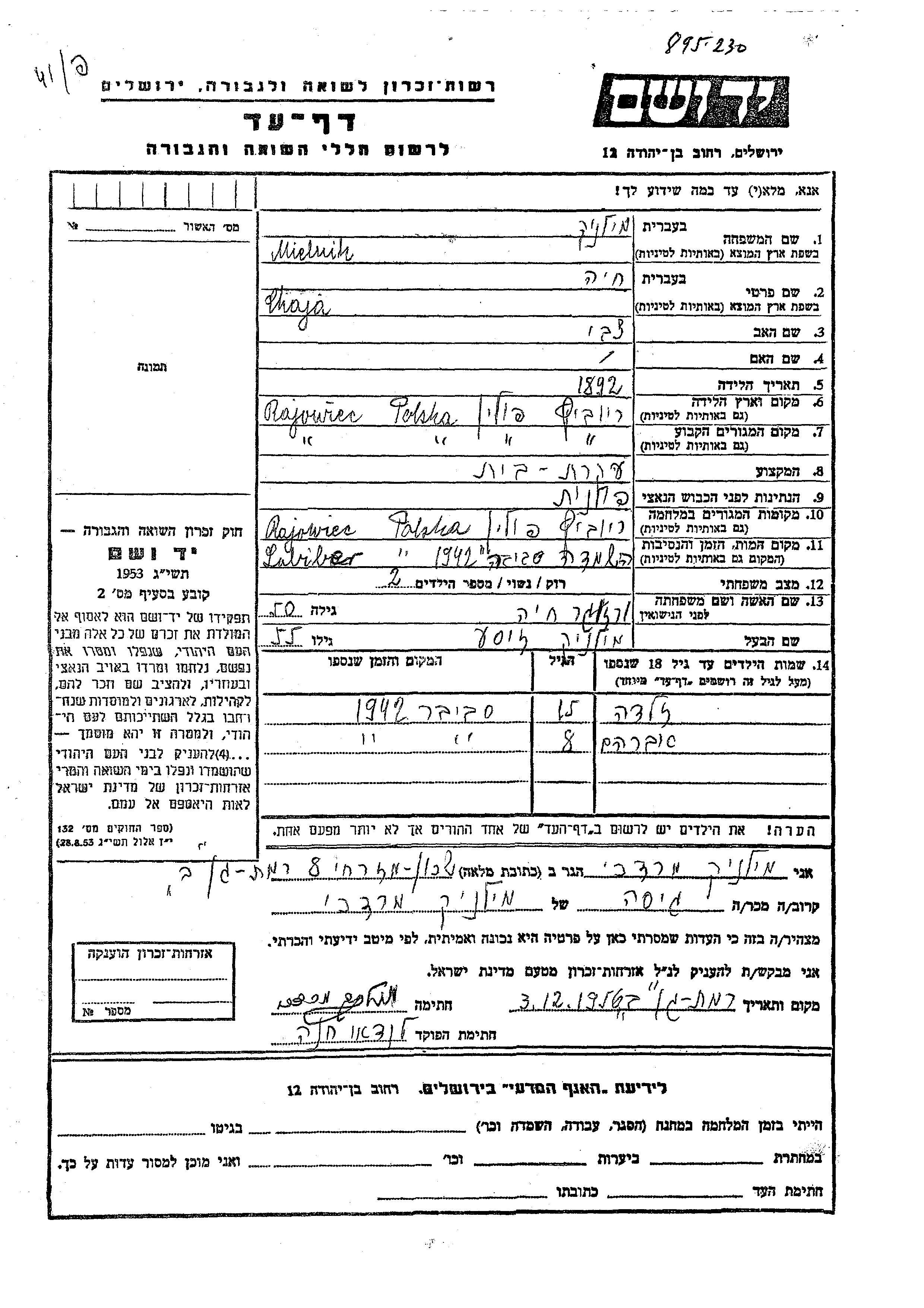 Melnik Chaia 1892 Raiovetz, Pologne Feuille de témoignage