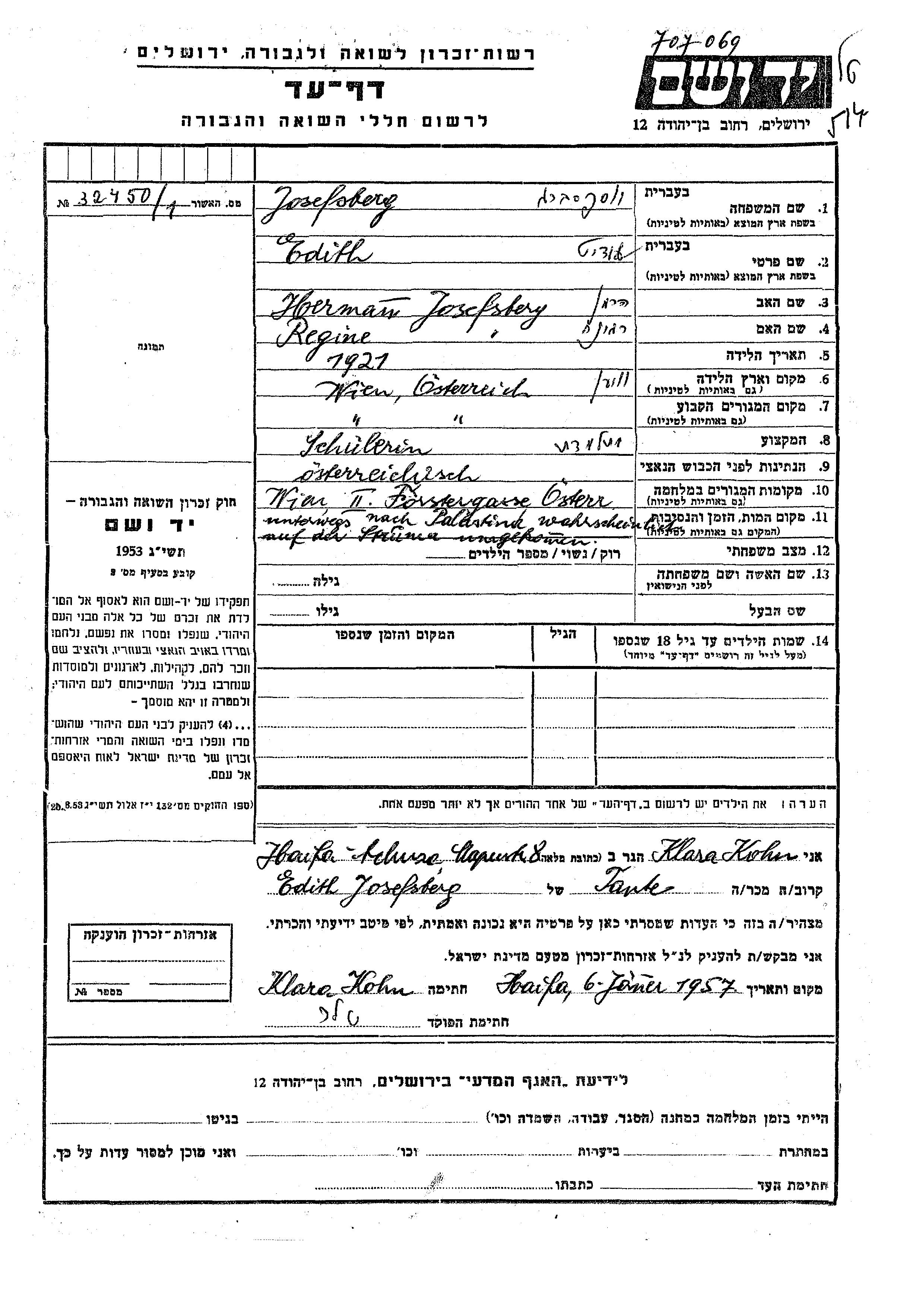 Josefsberg Edith 1921 Wien, Autriche Feuille de témoignage