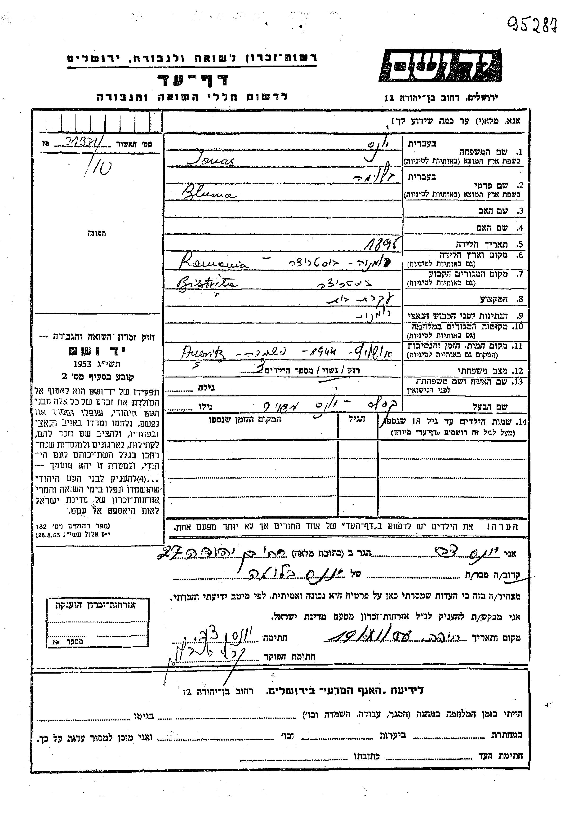 Jonas Bluma 1895 Bistrita, Roumanie Feuille de témoignage