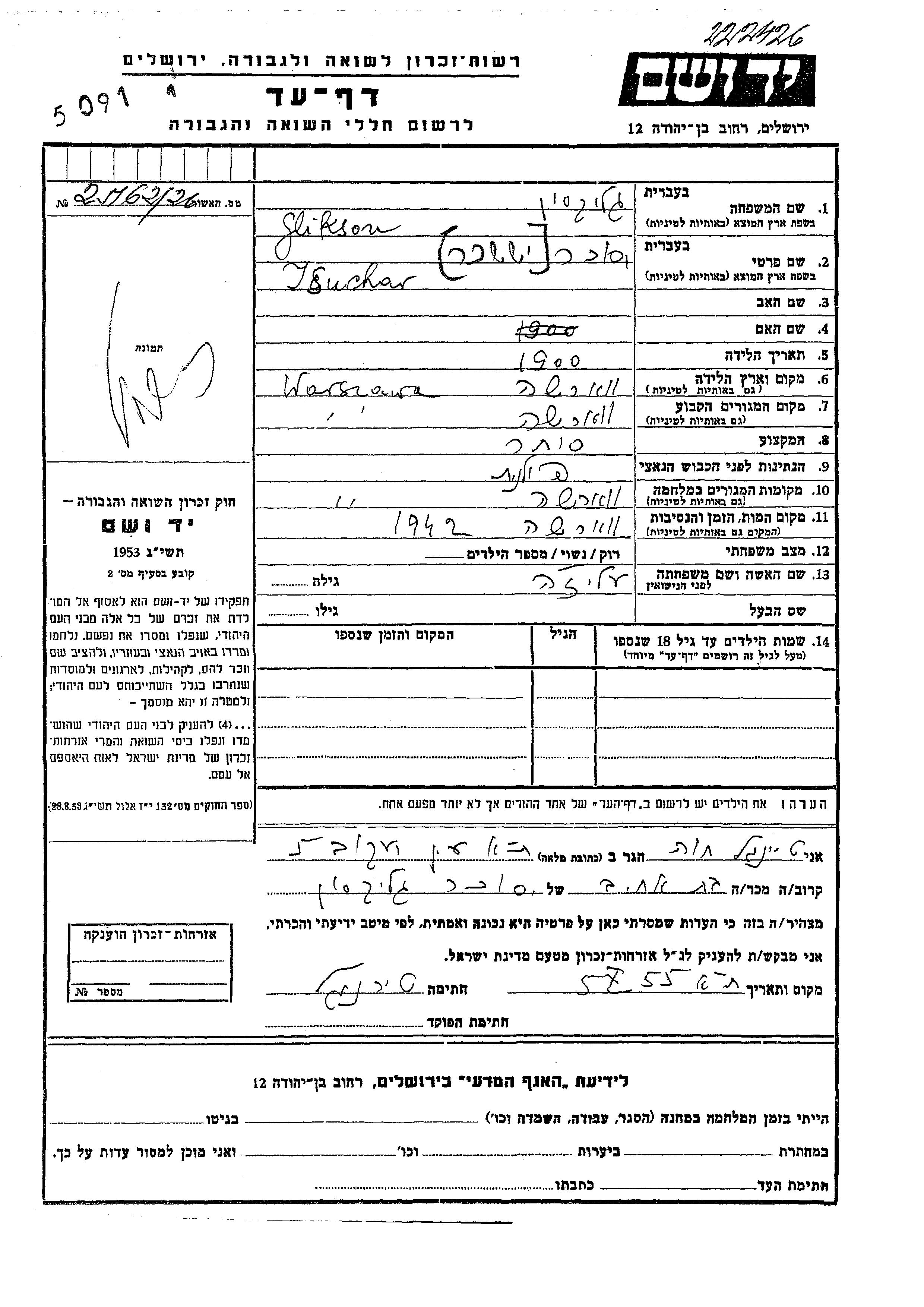 Glikson Jsuchar 1900 Warszawa, Pologne Feuille de témoignage