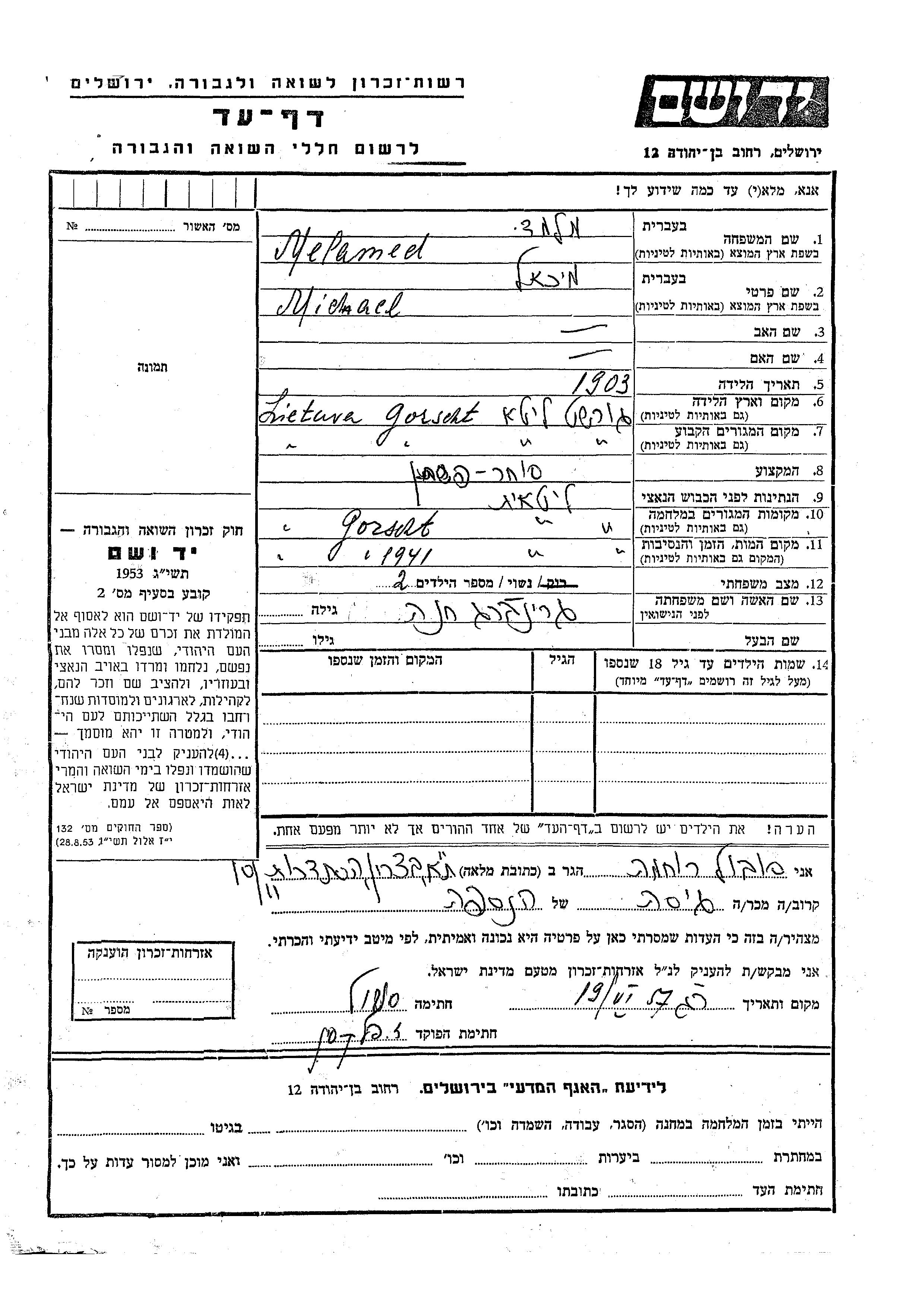 Michael Melamed est né à Gorest, Pologne en 1903. Il était Marchand de lin et Mariée à Khana née Grinberg. Avant la seconde guerre mondiale il vivait à Gorest, Pologne. Au cours de la guerre, il était à Gorest, Pologne.