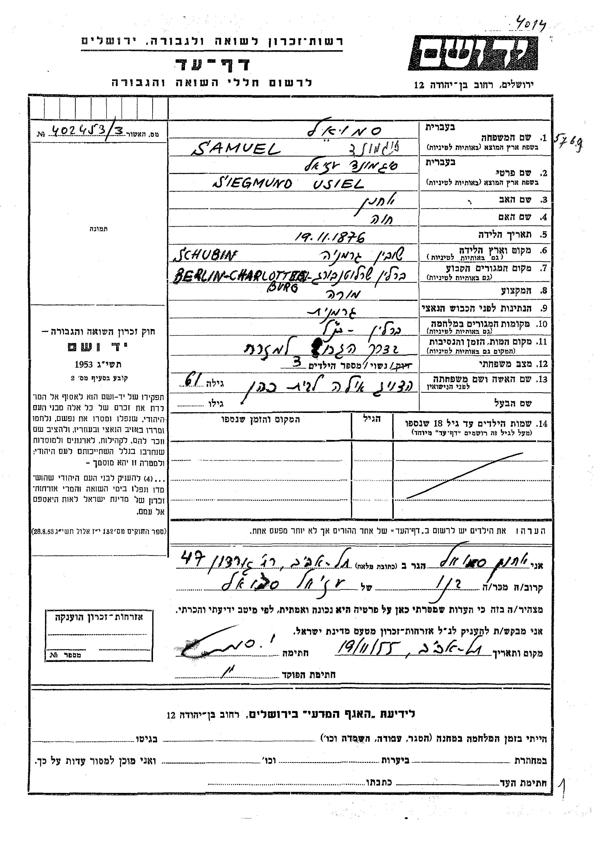 Siegmund Usiel Samuel est né à Schubin, Pologne en 1876, fils de Yokhanan et de Khava. Il était Enseignant/e et Mariée à Hedvig Ila née Kohen. Avant la seconde guerre mondiale il vivait à Charlottenburg, Allemagne. Au cours de la guerre, il était à Berlin, Allemagne.