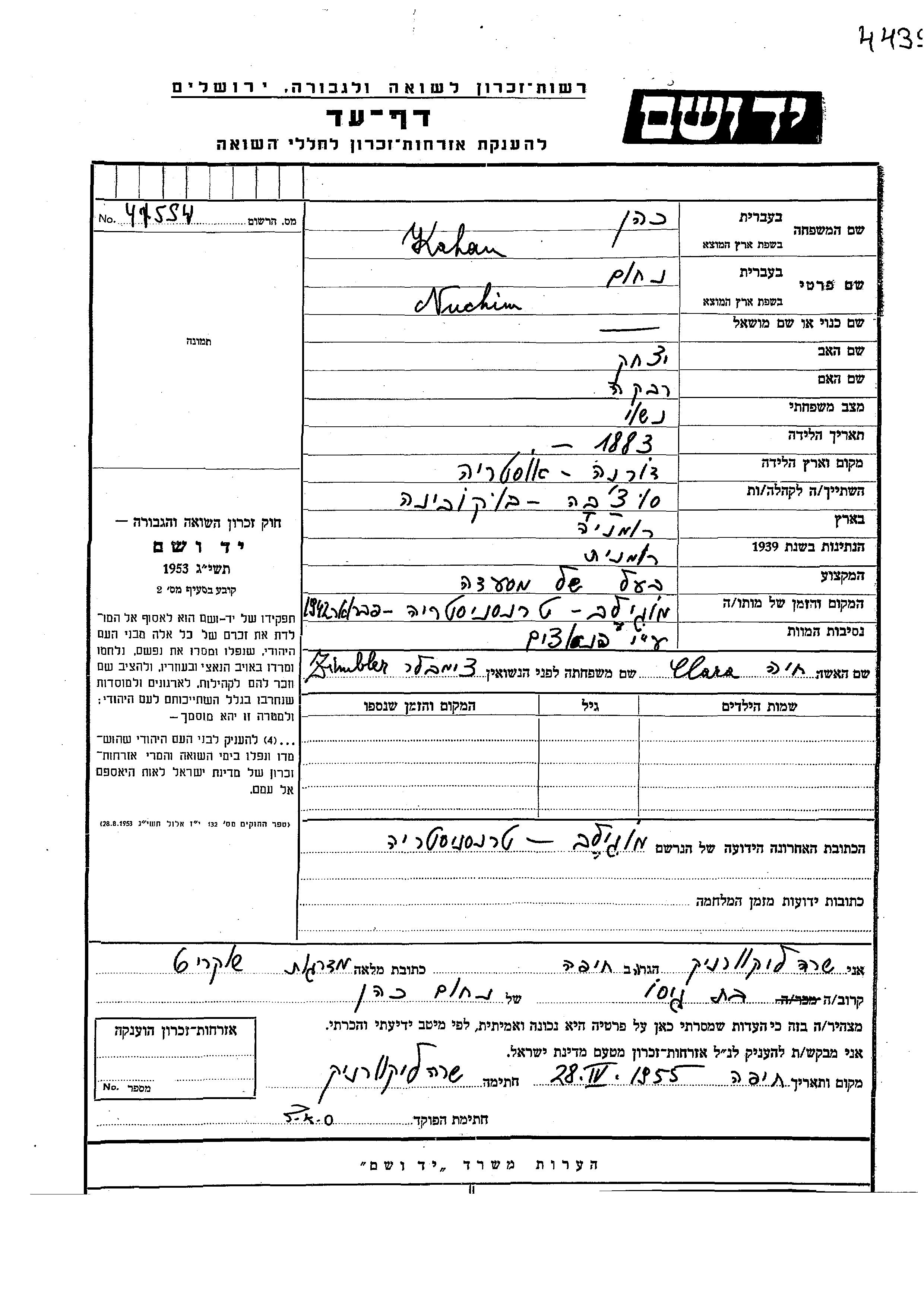 Nuchim a été assassiné pendant la Shoah. Lieu de la mort: Mohilev Podolsk, Ukraine (URSS) en 02/1942.