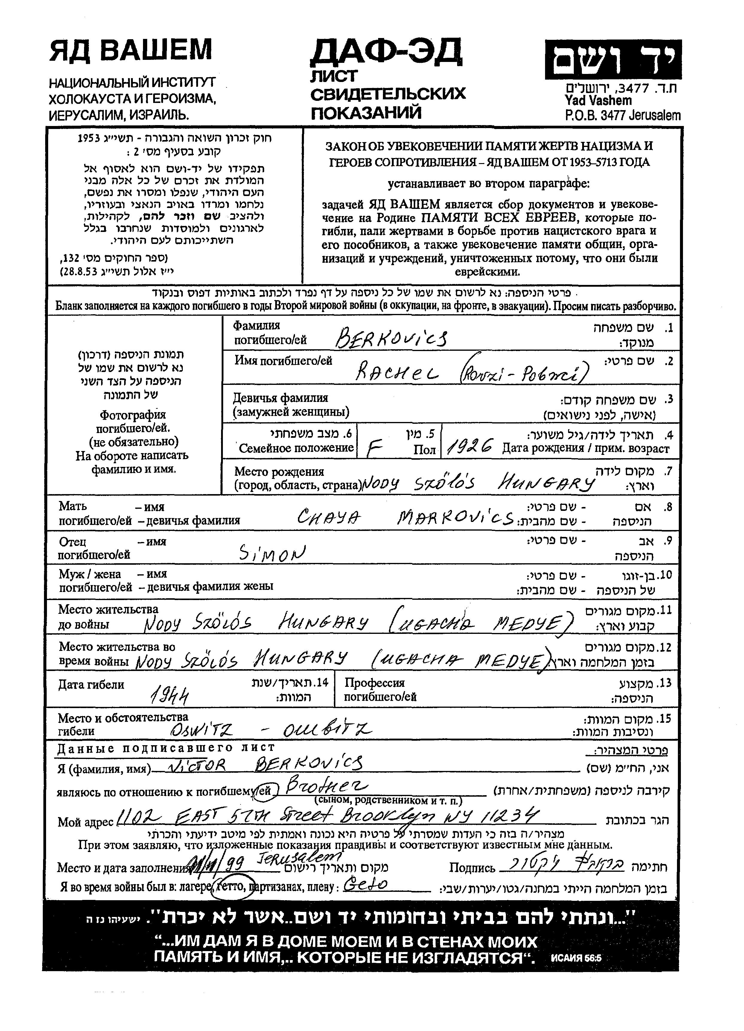 Berkovics Rachel Ronzi 1926 Nagyszollos, Tchécoslovaquie Feuille de témoignage