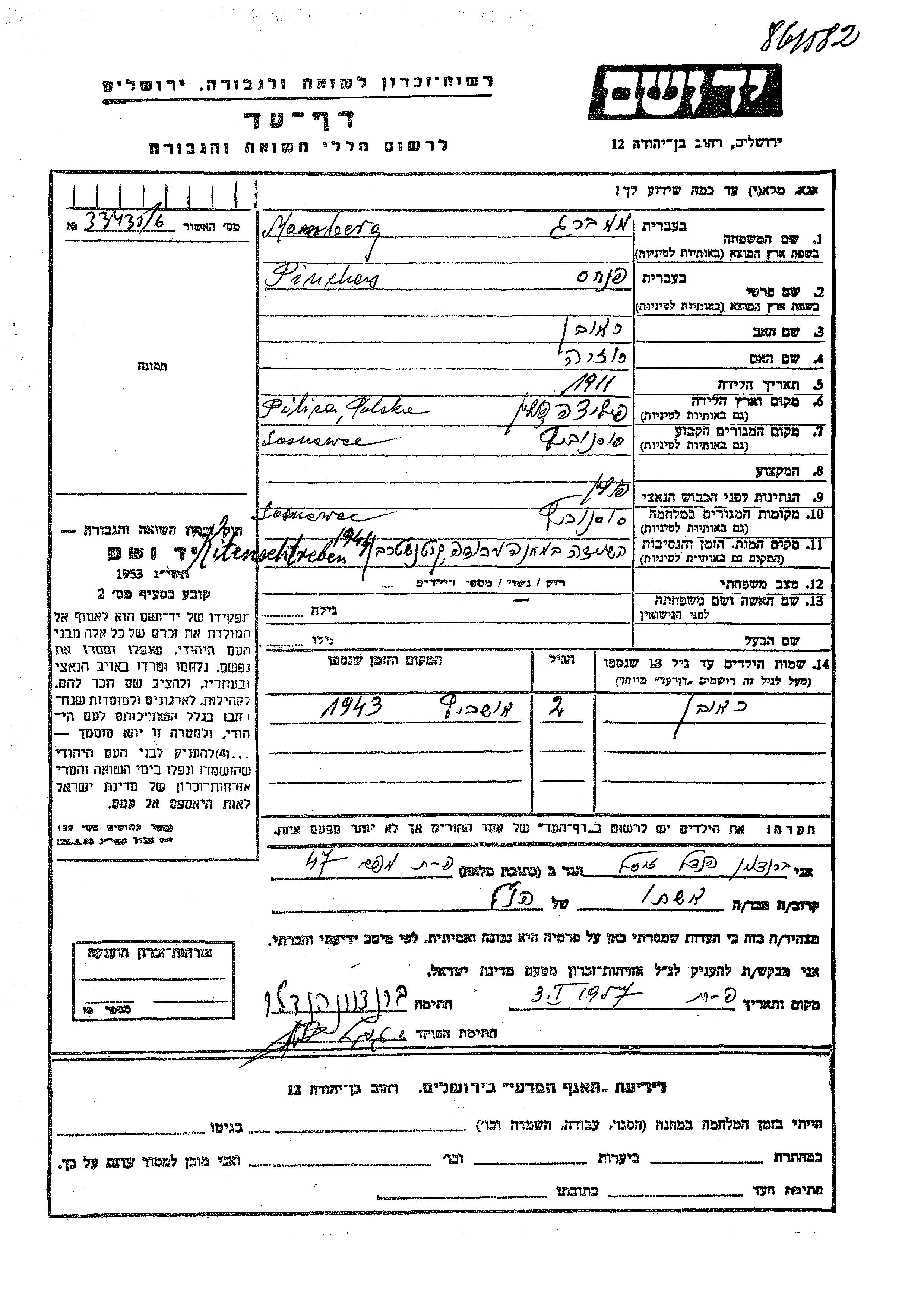 Pinchas Mamberg est né à Pilica, Pologne en 1911, fils de Reuven et de Rozia. Il était Marié. Avant la seconde guerre mondiale il vivait à Sosnowce, Pologne. Au cours de la guerre, il était à Sosnowce, Pologne.