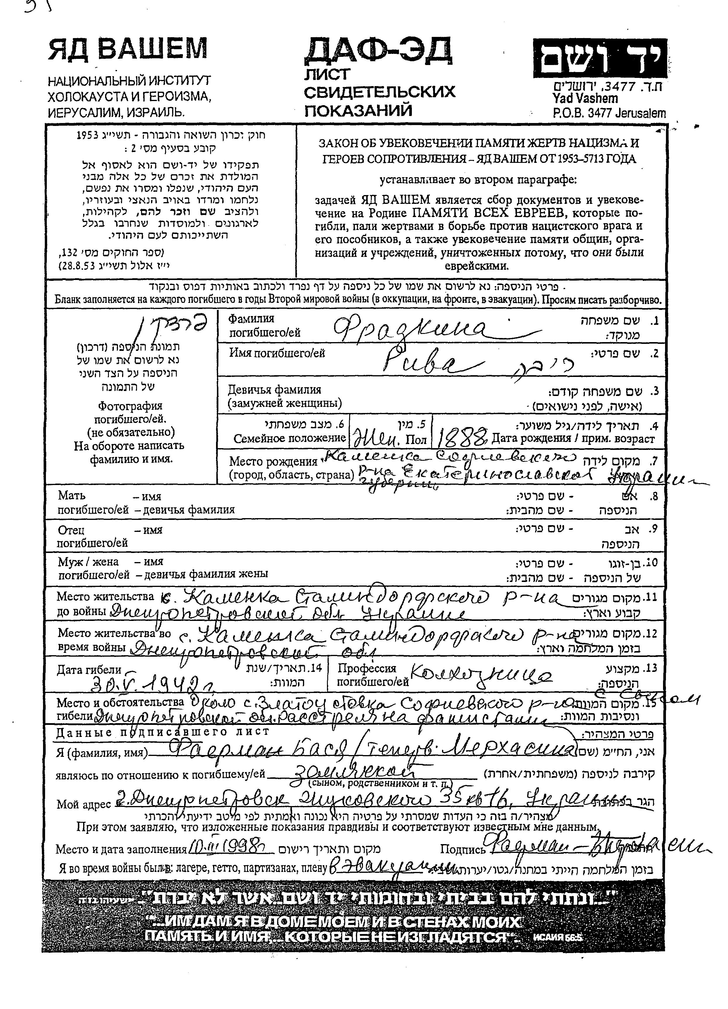 Fradkin Riwa 1888 Kamenka, Ukraine (URSS) Feuille de témoignage