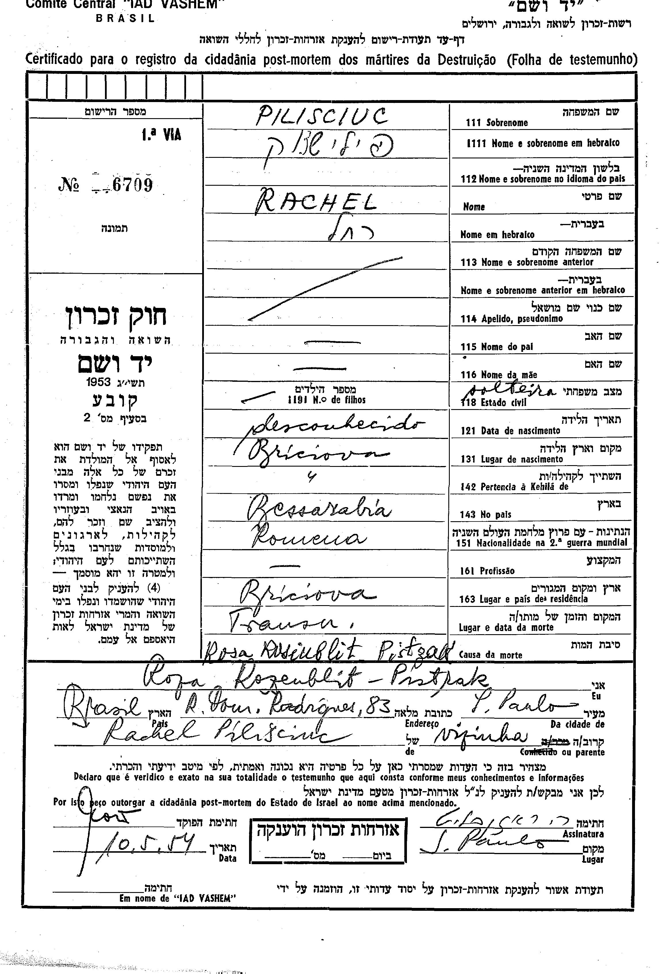 Pilisciuc Rachel Briciova, Roumanie Feuille de témoignage
