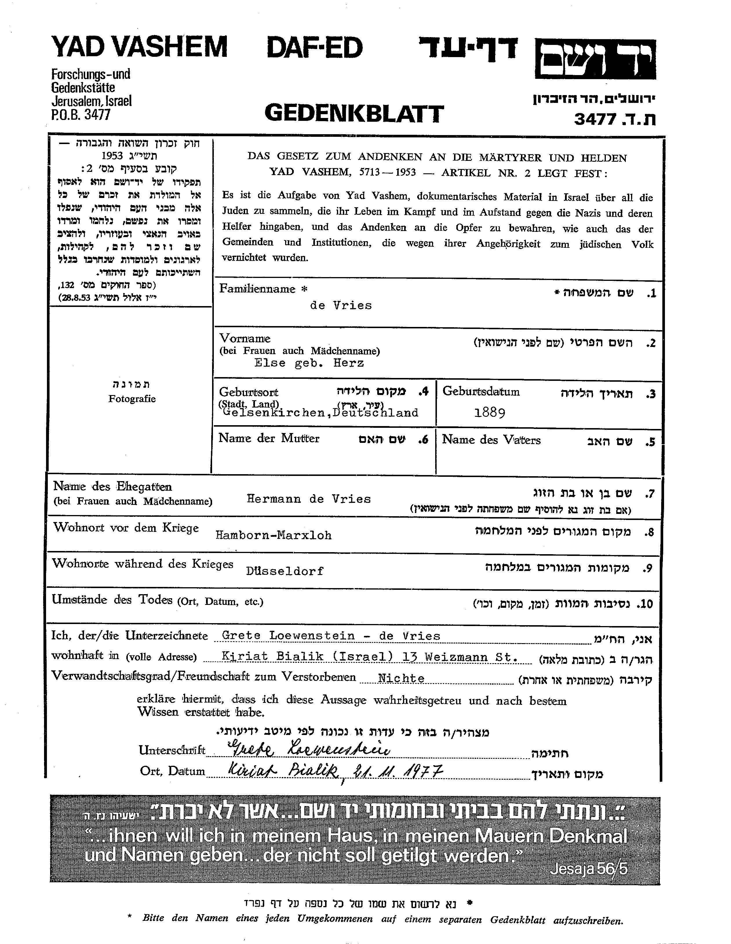 Else Vries de née Herz est née à Gelsenkirchen, Allemagne en 1889. Elle était Mariée à Hermann. Avant la seconde guerre mondiale elle vivait à Hamborn, Allemagne. Pendant la guerre, elle était à Duesseldorf, Allemagne.