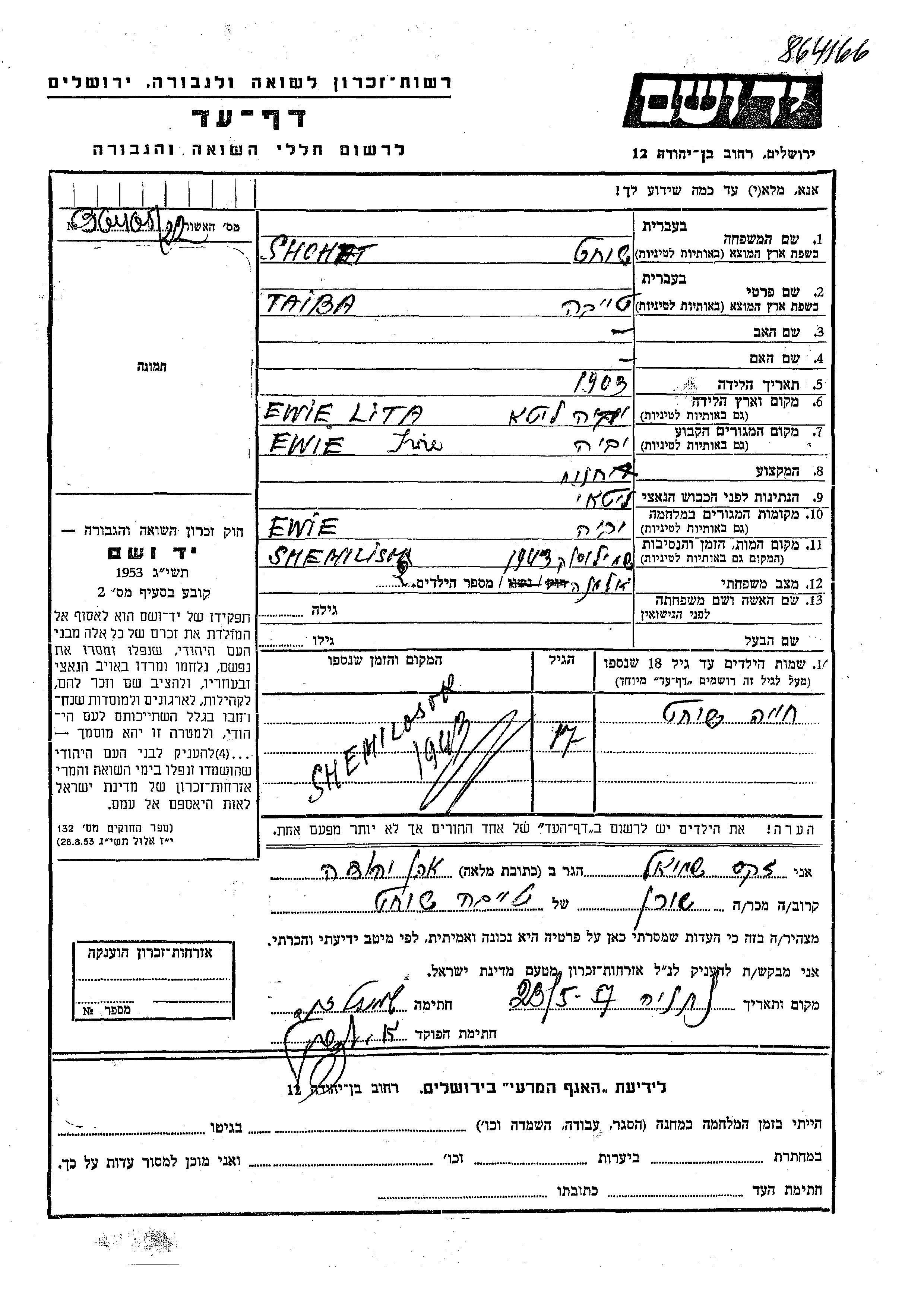 Taiba Shochet est née à Ewie, Pologne en 1903. Elle était veuve. Avant la seconde guerre mondiale elle vivait à Ewie, Pologne. Pendant la guerre, elle était à Ewie, Pologne.