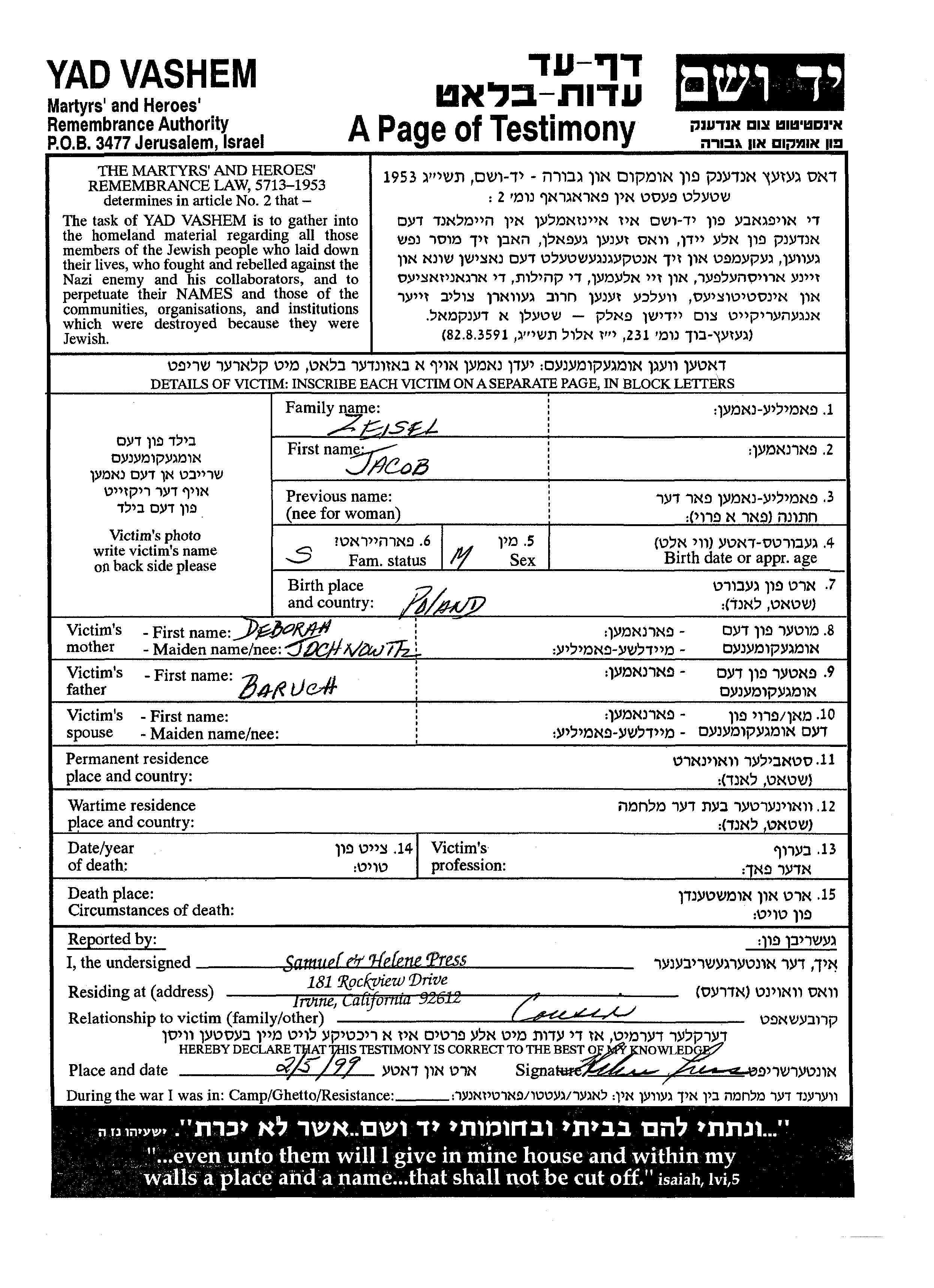Zeisel Jacob endroit inconnu, Feuille de témoignage