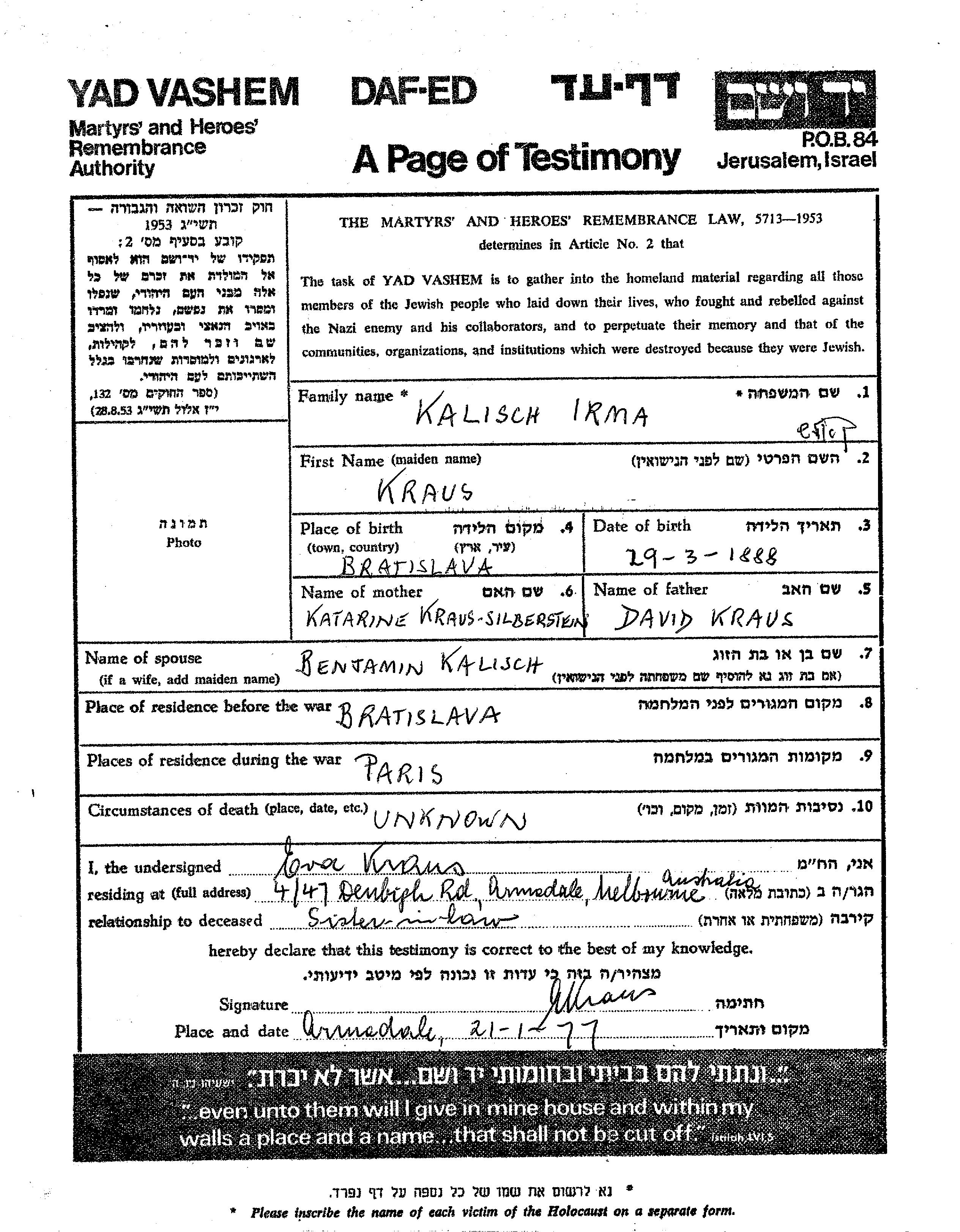 Kalisch Irma 1888 Bratislava, Tchécoslovaquie Feuille de témoignage