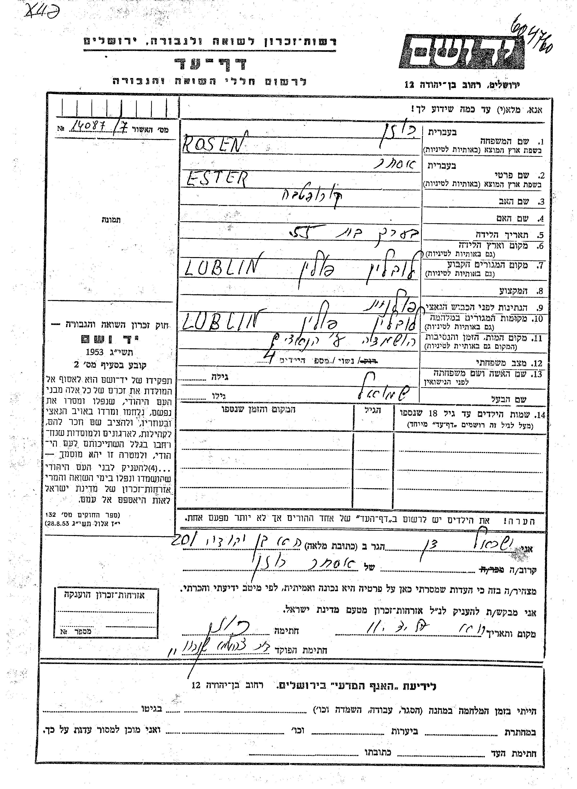 Ester Rosen née Kuropatva. Elle était Mariée à Shmuel. Avant la seconde guerre mondiale elle vivait à Lublin, Pologne. Pendant la guerre, elle était à Lublin, Pologne.