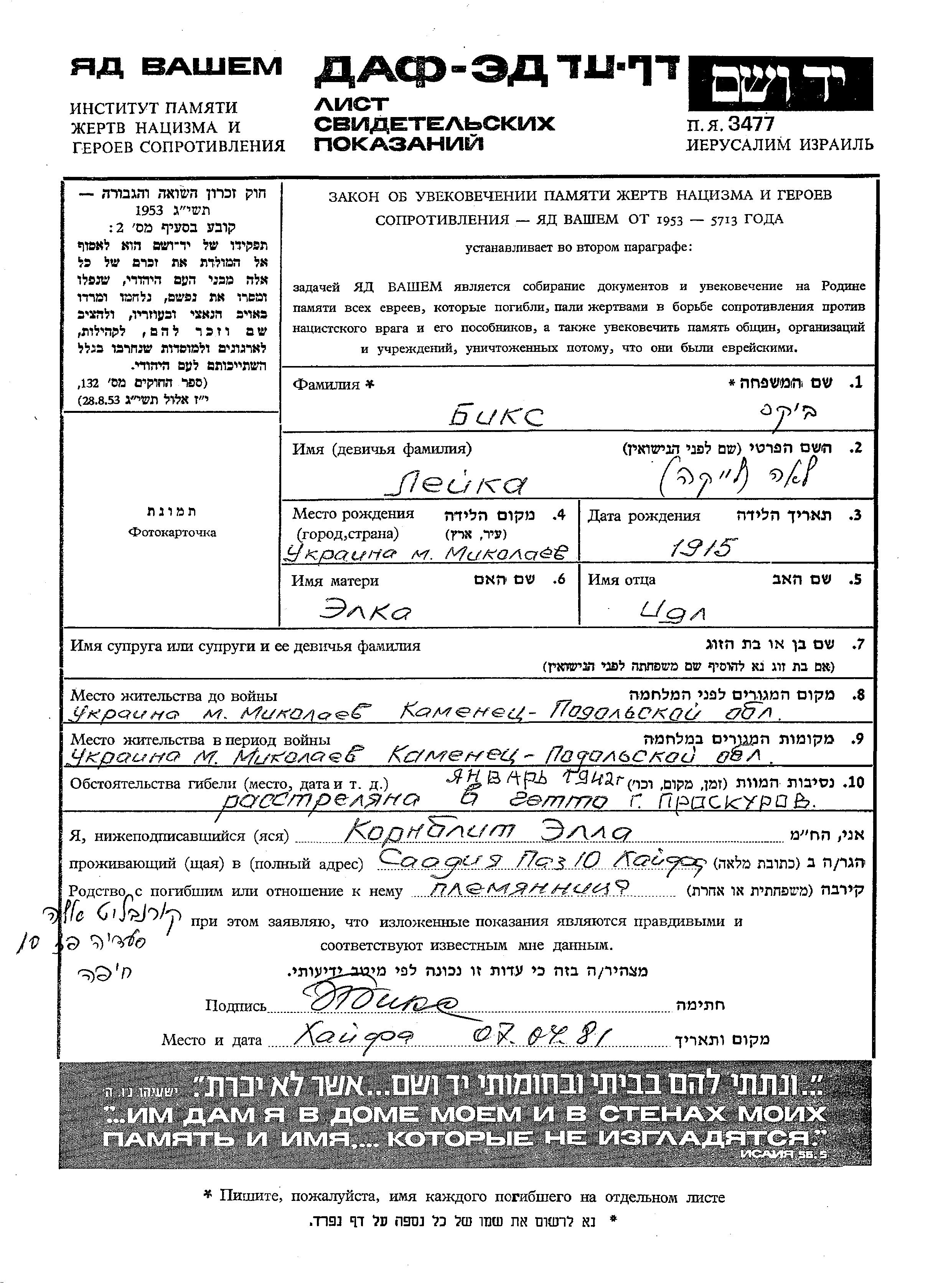 Leika Biks est née à Nikolayev, Ukraine (URSS) en 1915, fille de Idl et de Elka. Avant la seconde guerre mondiale elle vivait à Nikolayev, Ukraine (URSS). Pendant la guerre, elle était à Nikolayev, Ukraine (URSS).