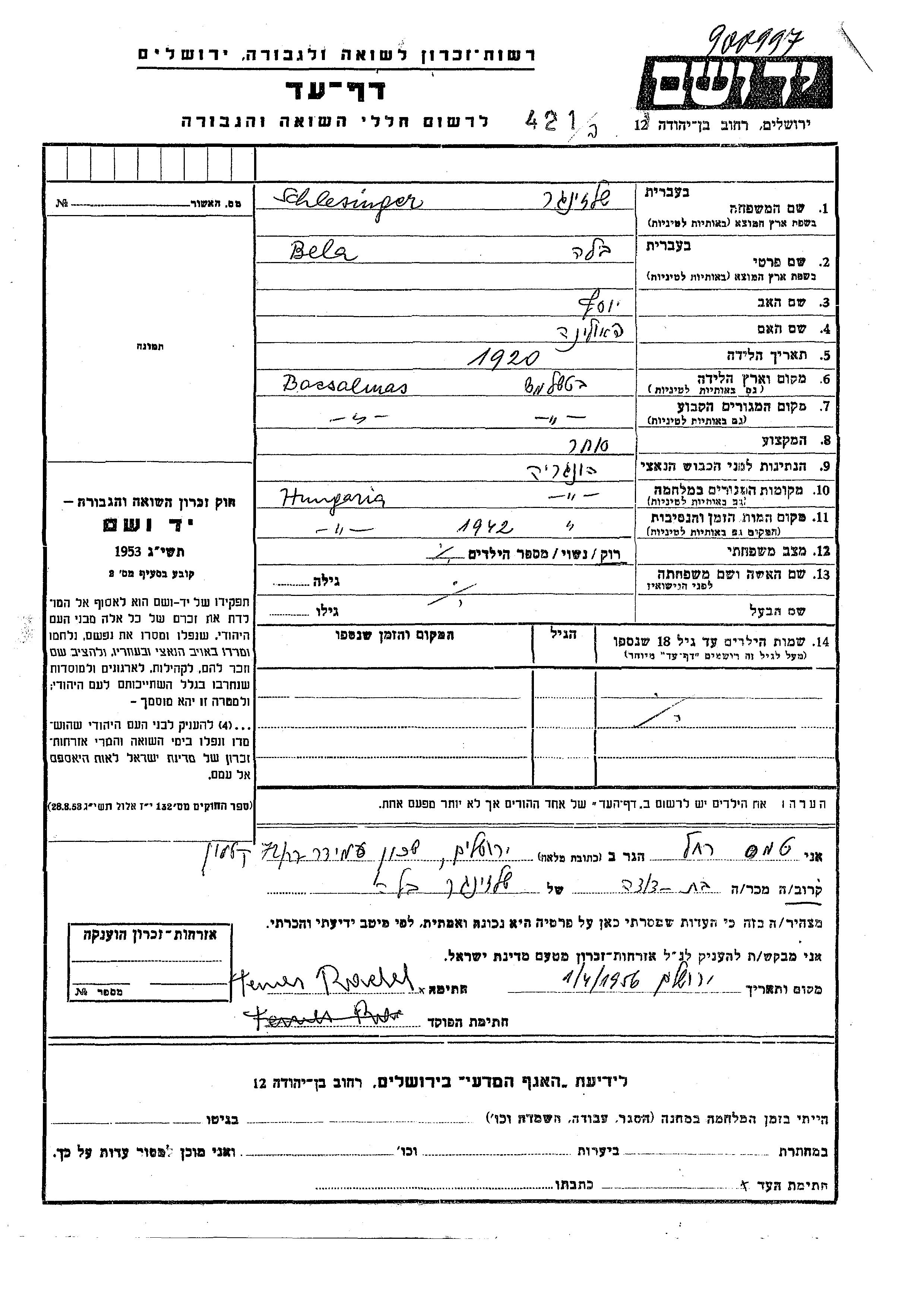 Schlesinger Bila 1920 Bácsalmás, Hongrie Feuille de témoignage