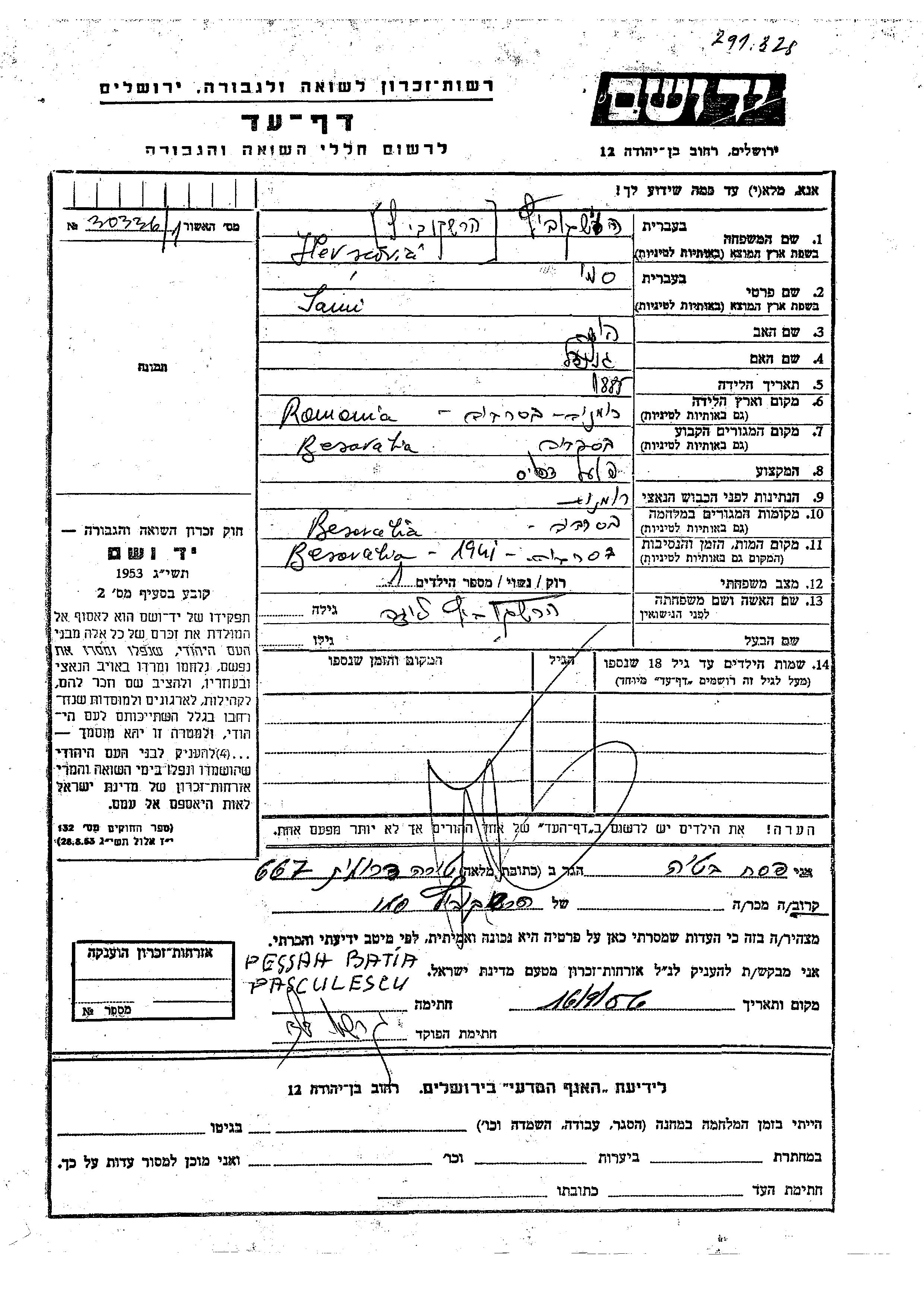 Herşcovici Sami 1885 Roumanie Feuille de témoignage