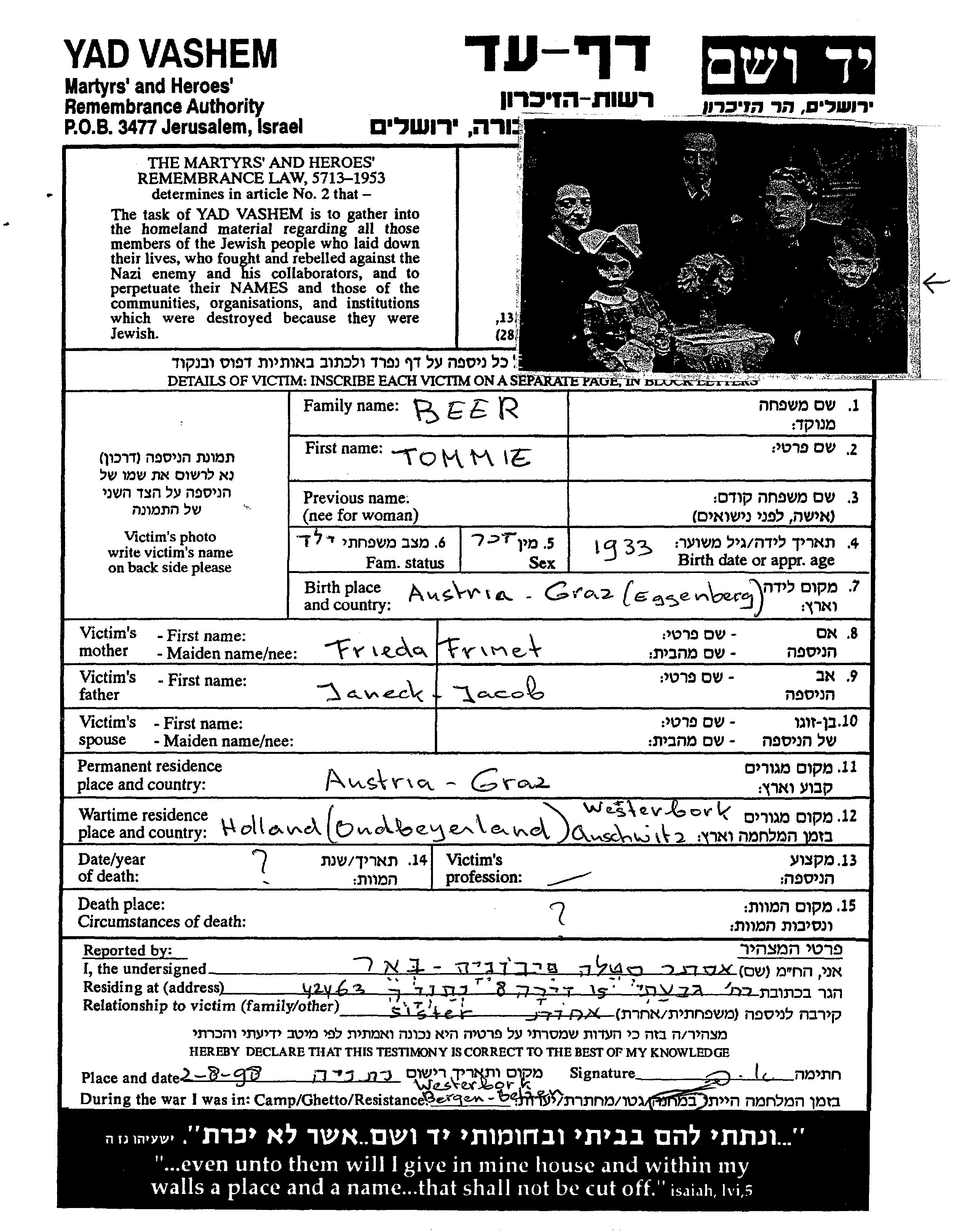Tommie Beer est né à Graz, Autriche en 1933, fils de Janek Jakob et de Frieda. Il était Célibataire. Au cours de la guerre, il était à Westerbork, Pays Bas.
