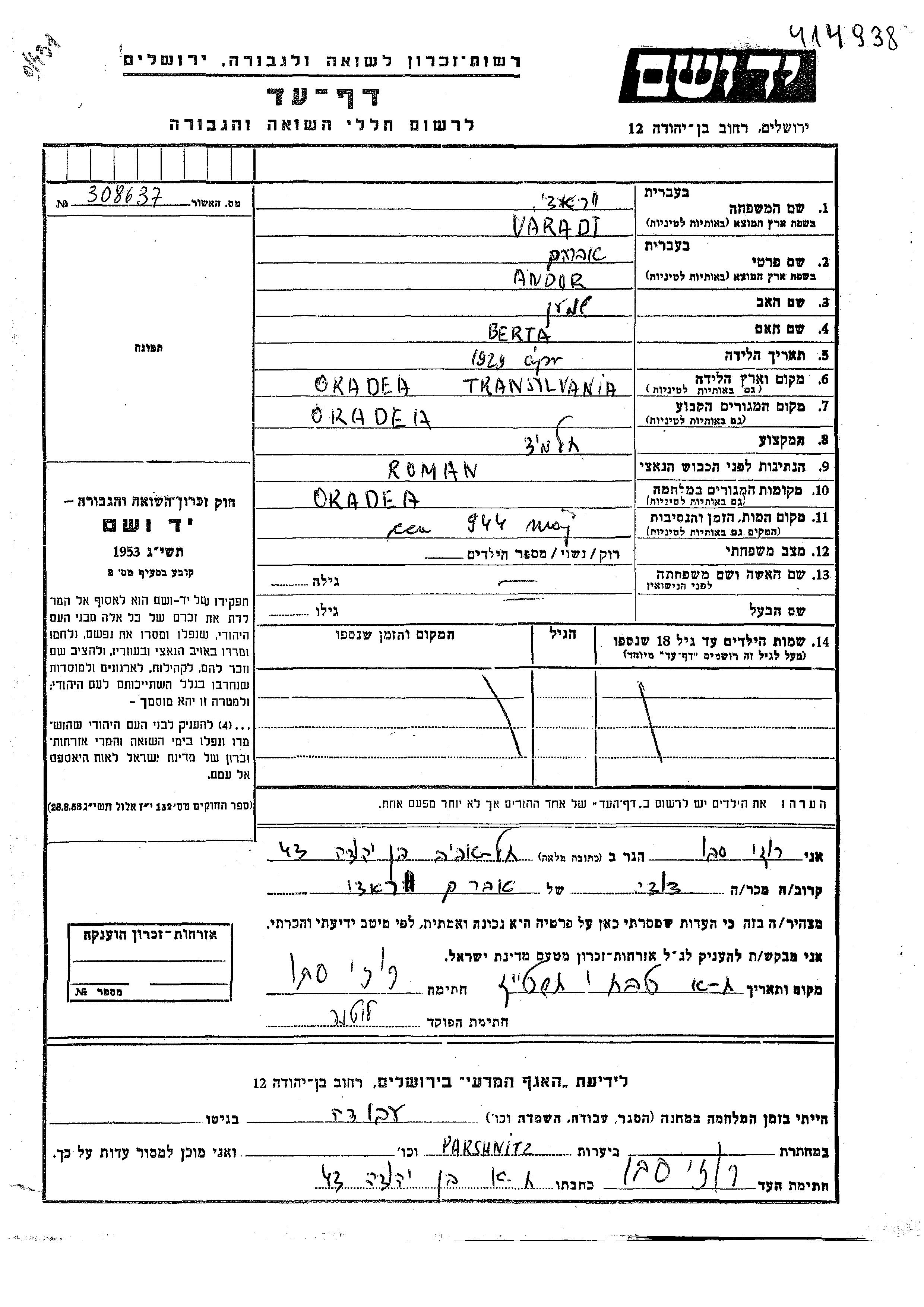 Varadi Andor Avraham 1929 Oradea, Roumanie Feuille de témoignage