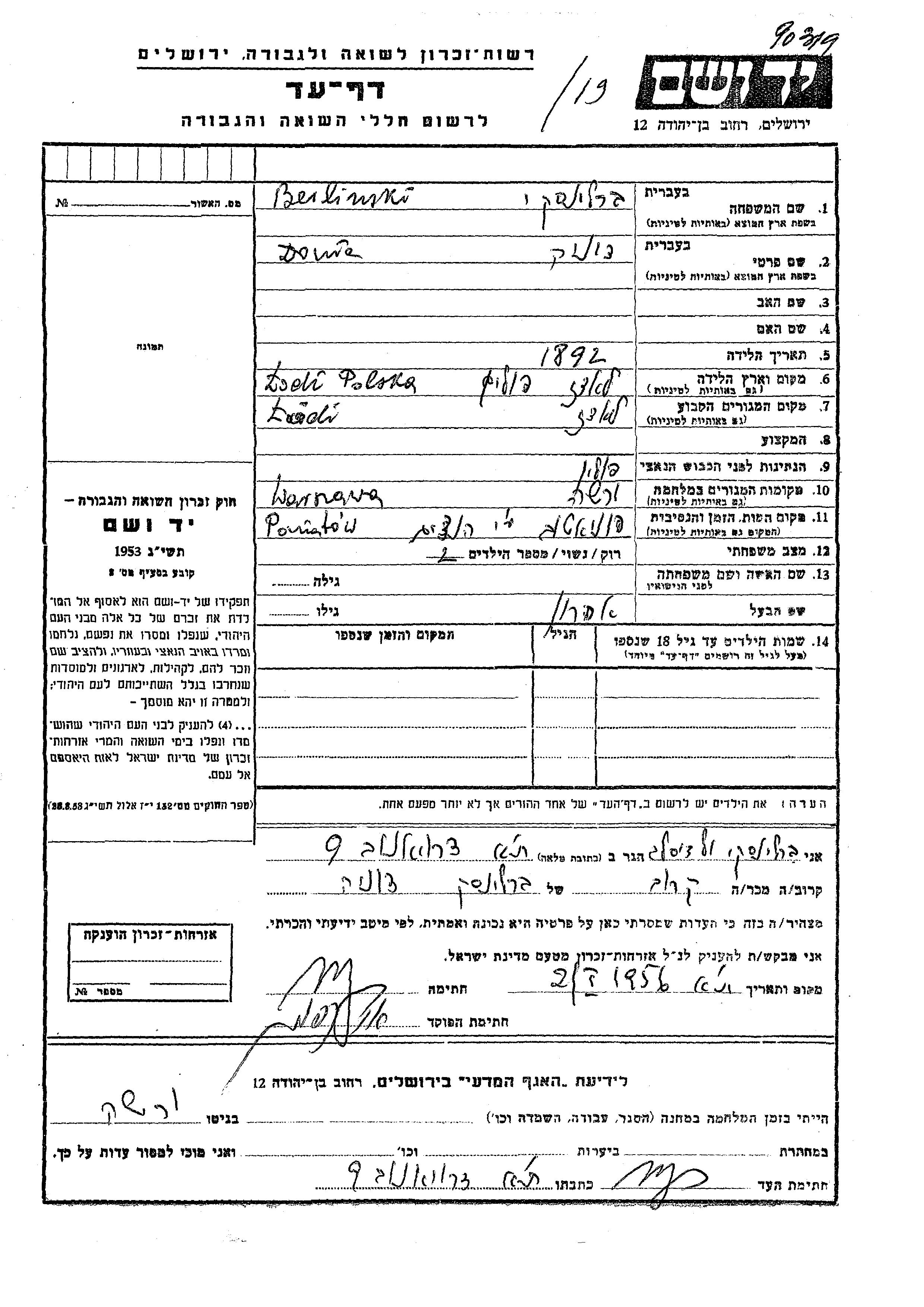 Berlinski Donia 1892 Lodz, Pologne Feuille de témoignage