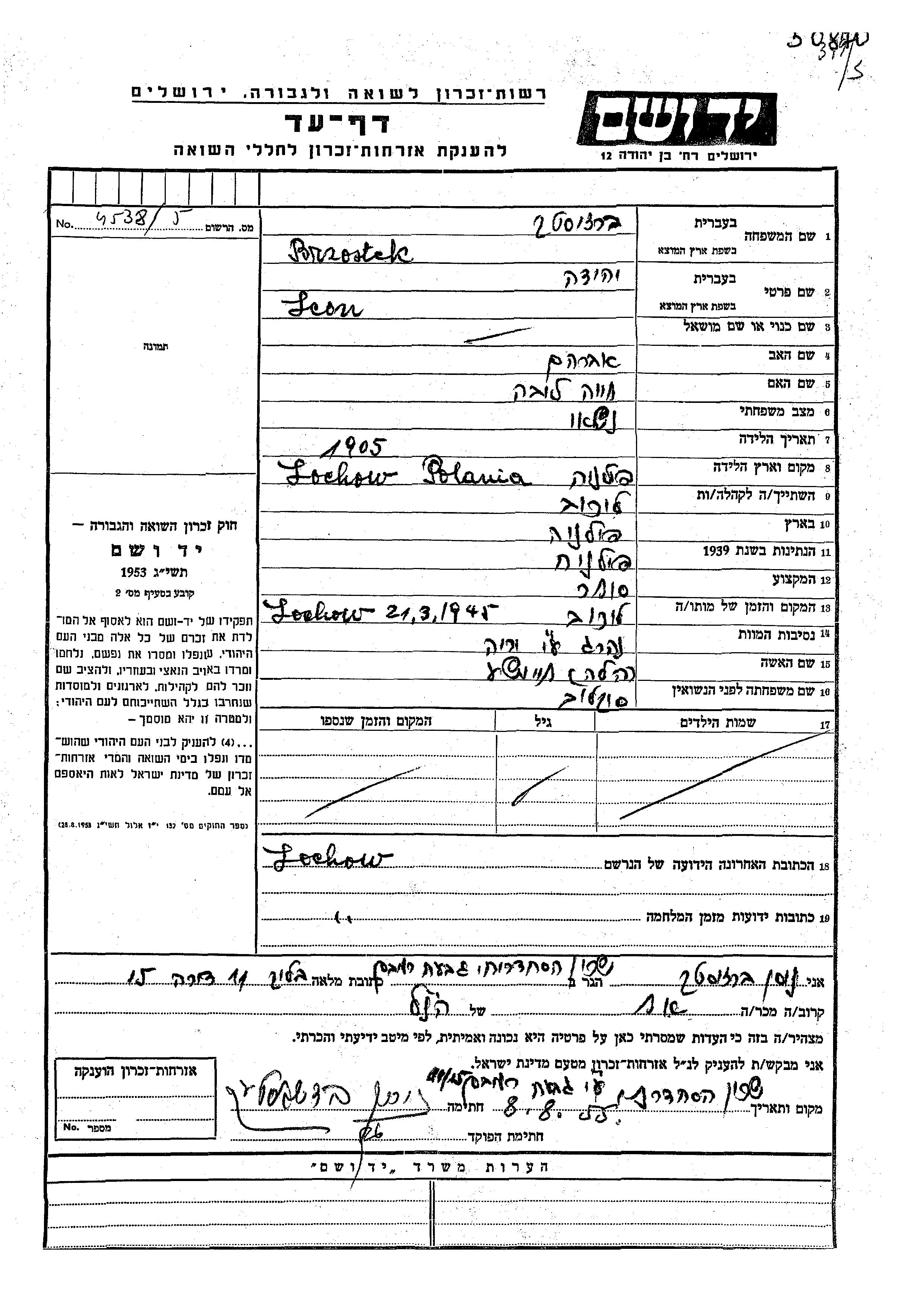 Brzostek Leon Yehuda 1905 Lochow, Pologne Feuille de témoignage
