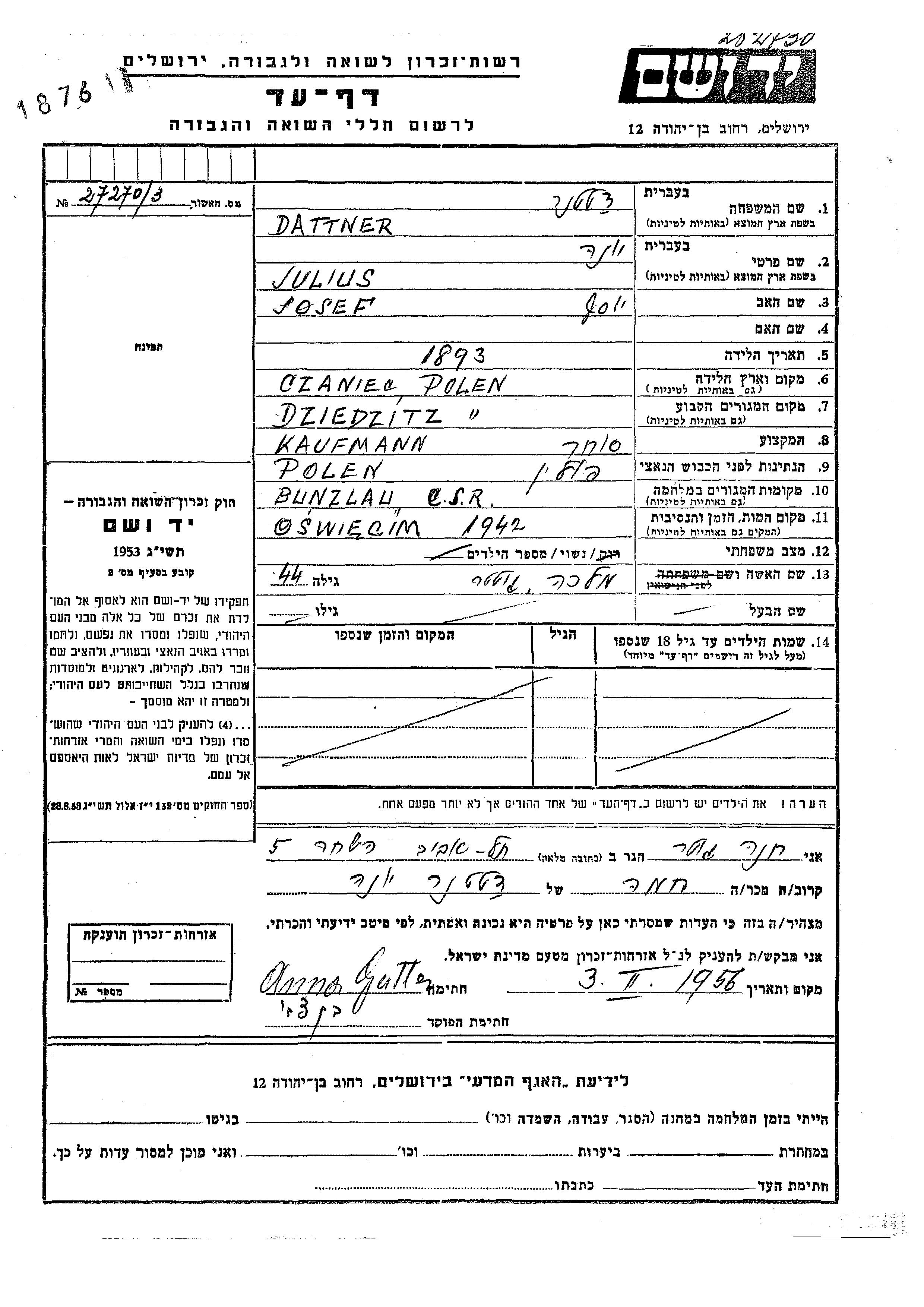 Dattner Julius Yona 1893 Dziedzitz, Pologne Feuille de témoignage