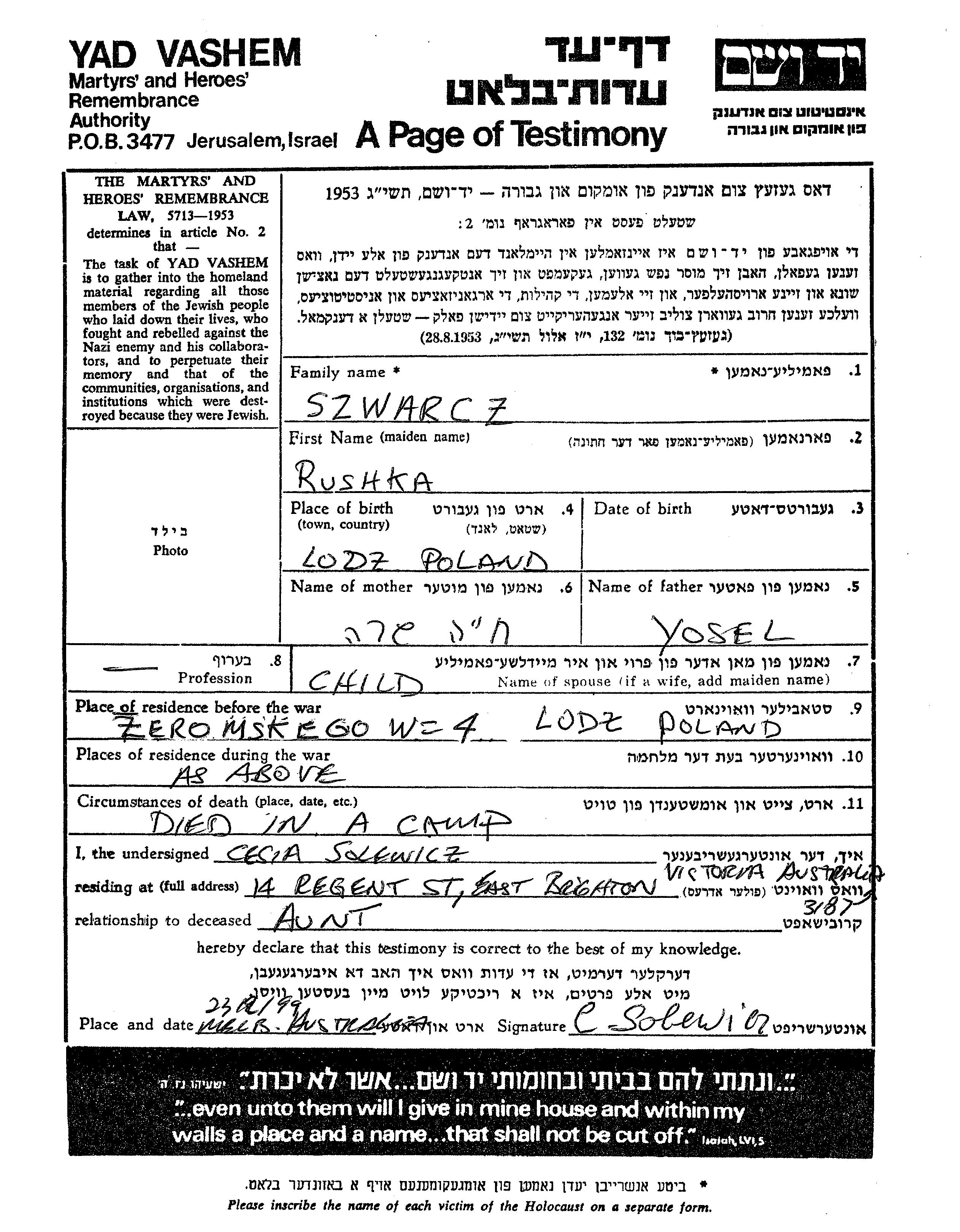Szwarczalc Rushka Lodz, Pologne Feuille de témoignage