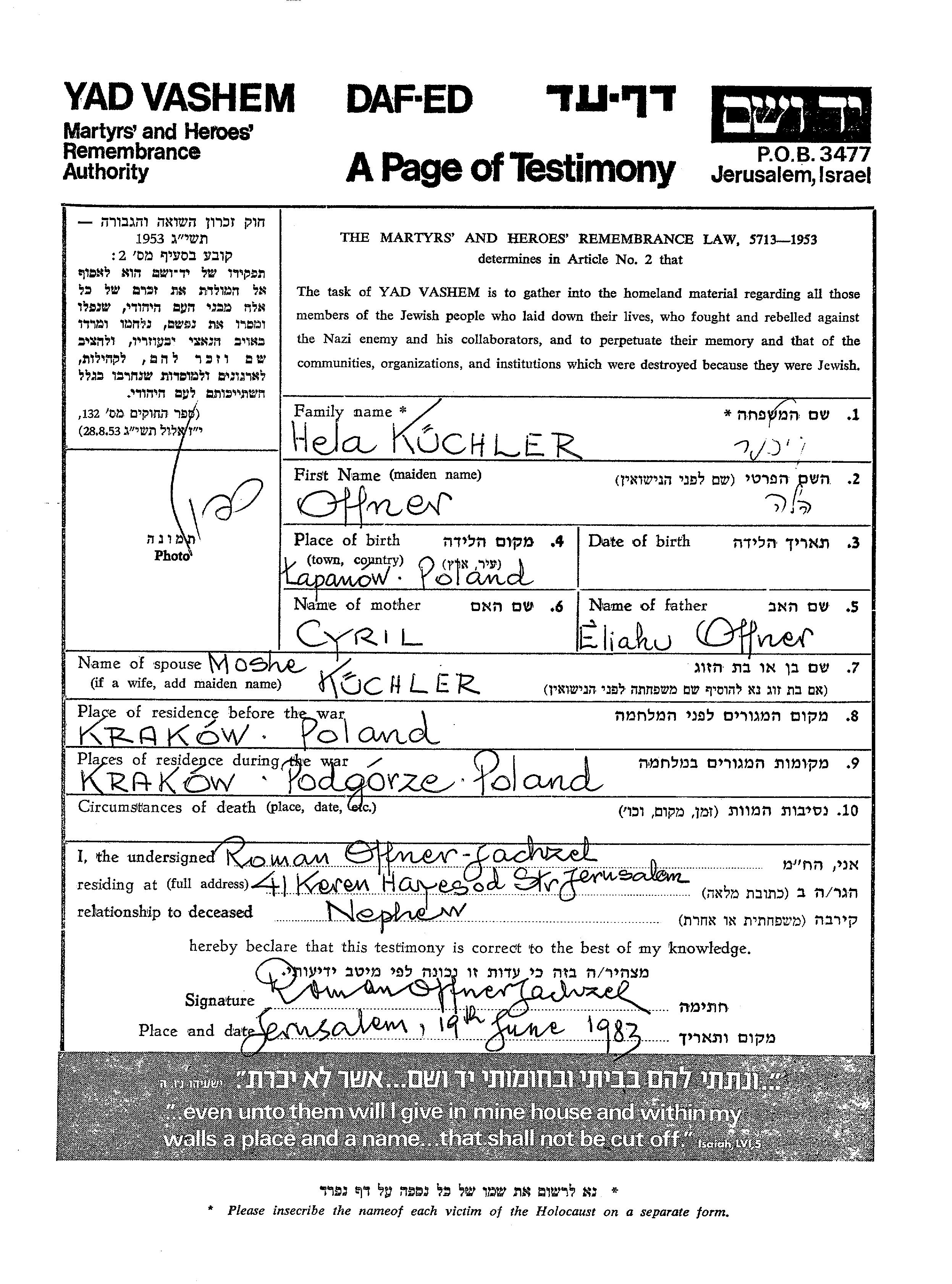Hela Kuchler née Offner est née à Lapanow, Pologne, fille de Eliahu et de Cyril. Elle était Mariée à Moshe. Avant la seconde guerre mondiale elle vivait à Krakow, Pologne. Pendant la guerre, elle était à Krakow, Pologne.